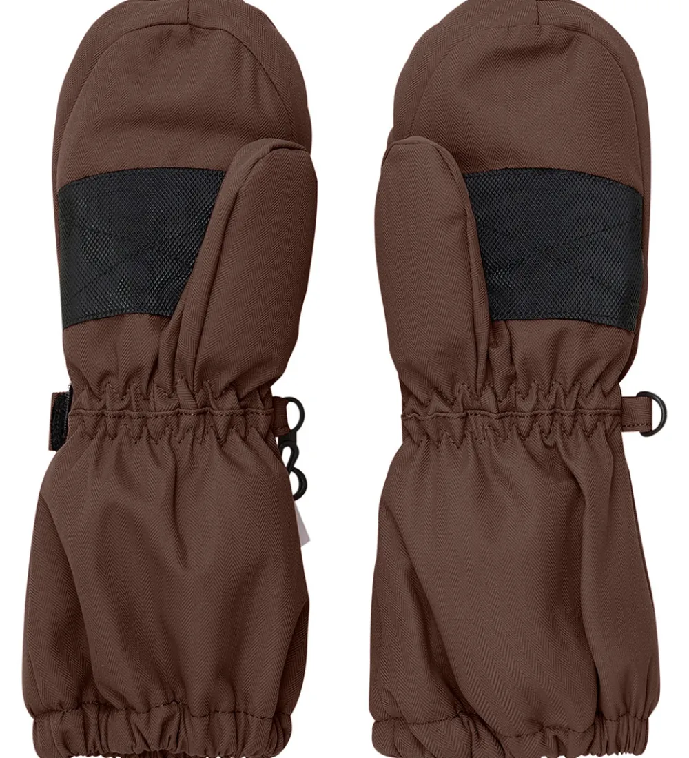 Lækre Minymo luffer i mørkebrun med et lille reflekslogo øverst. Minymo lufferne har elastik i åbningen, og kan strammes med en velcrorem omkring håndleddet. Lufferne har blødt fleecefor indvendigt.