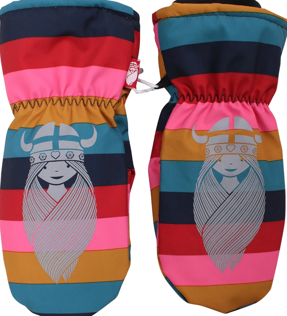 Fine Danefæ luffer med striber i pink, rød, navy, petroleumsblå og karrygul og et refleks-vikingeprint på håndryggen.