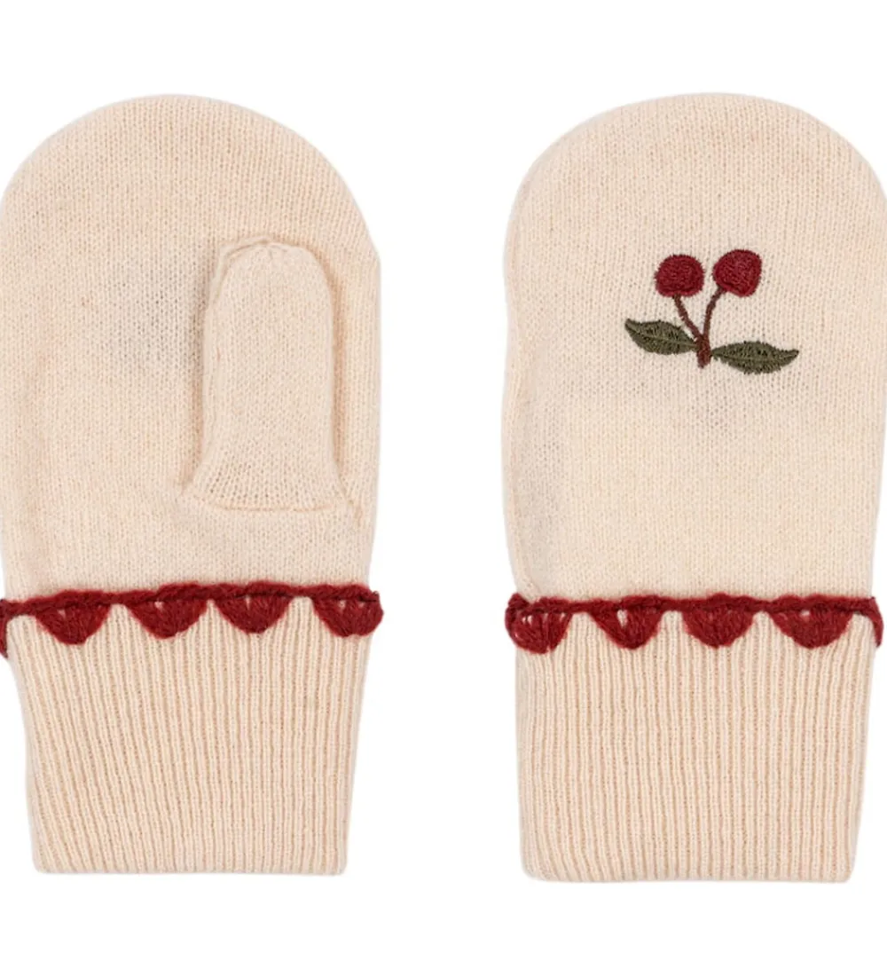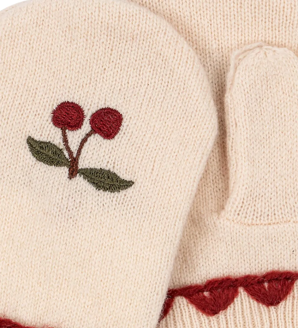 Skønne Konges Sløjd luffer i creme med et pudderrosa skær, og på oversiden er der broderet et par kirsebær. Langs ribkanten er der en rød bølgekant. Lufferne hra en bred ribkant og en tommelfinger, og de består af et enkelt lag i en blød, strikket uldkvalitet.