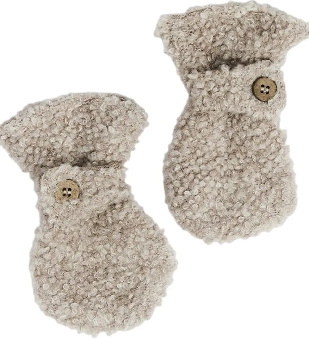 Lækre Smallstuff luffer i beige bouclé. Lufferne har elastik omkring håndleddene og kan lukkes med en knap med to indstillinger. Lufferne består af to lag i uld og polyamid.
