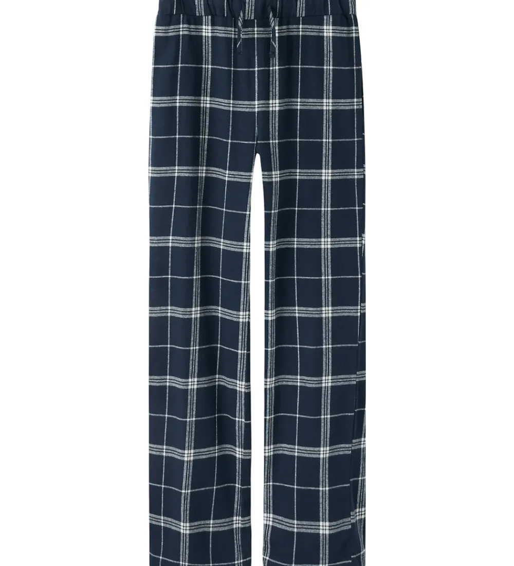 Lækre natbukser fra LMTD i navyblå med ternet mønster i hvid. Natbukserne har en elastisk talje, som kan justeres med snører foran. De har en lomme i hver side. Natbukserne har en afslappet pasform og en let børstet overflade, som gør dem behagelige at have på.