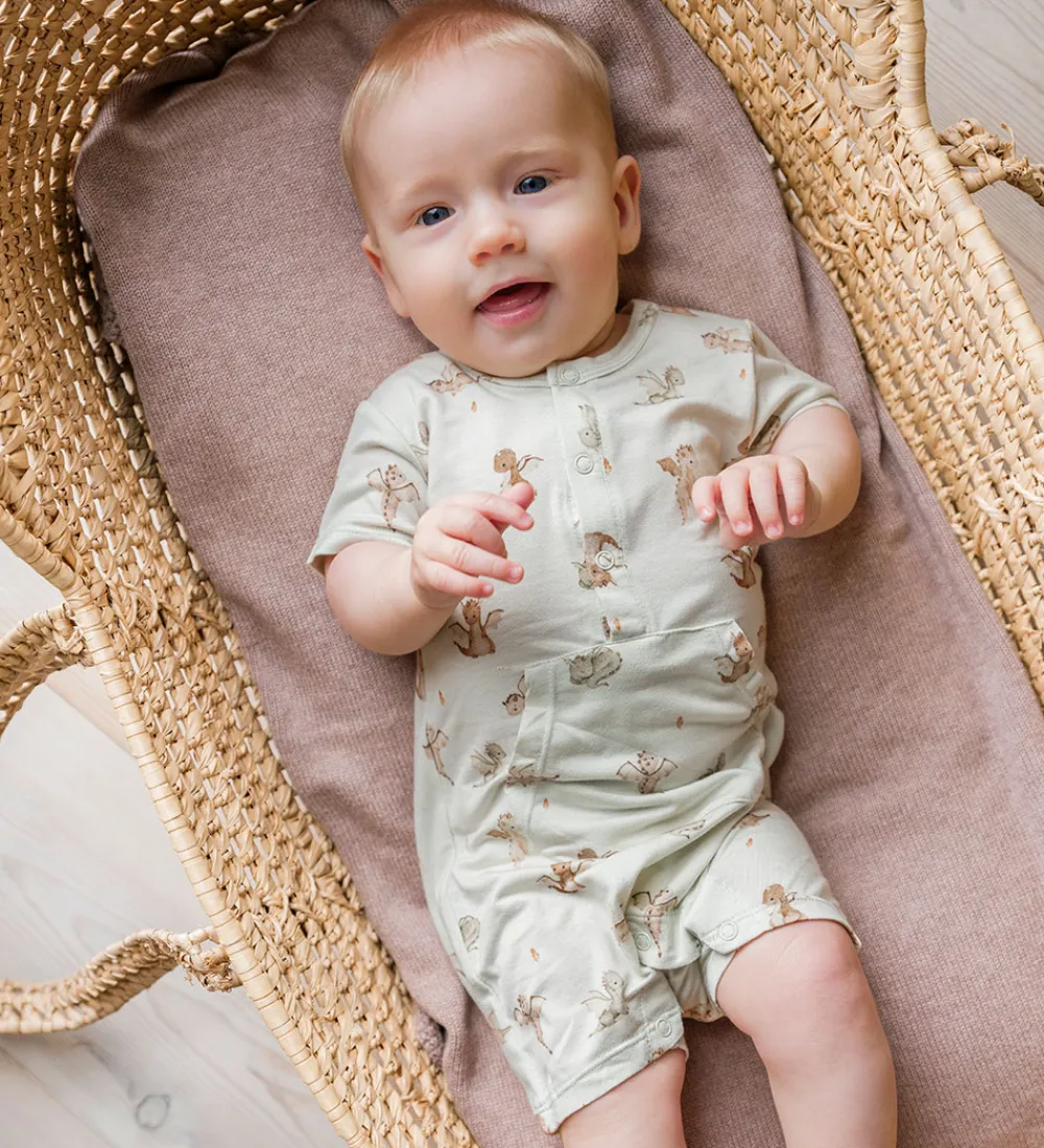 Charmerende Hust and Claire natdragt med korte ærmer, dekoreret med et fint mønster af små drager i grønne og brune nuancer. Natdragten har praktiske trykknapper ved halsudskæringen og en kængurulomme foran.