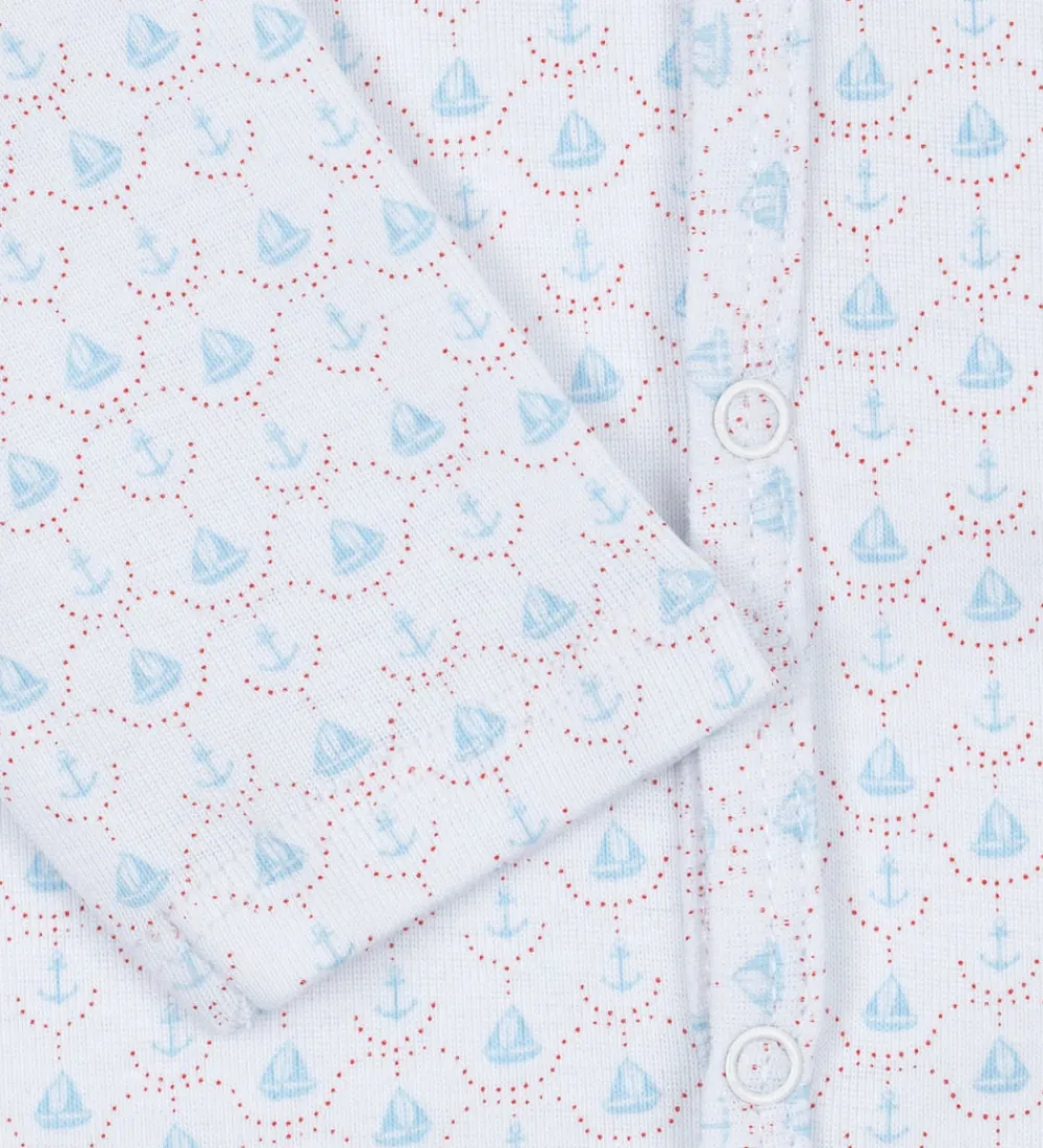Fin natdragt fra Fanga Fontana i hvid med et delikat mønster af små, blå sejlbåde og røde prikker.