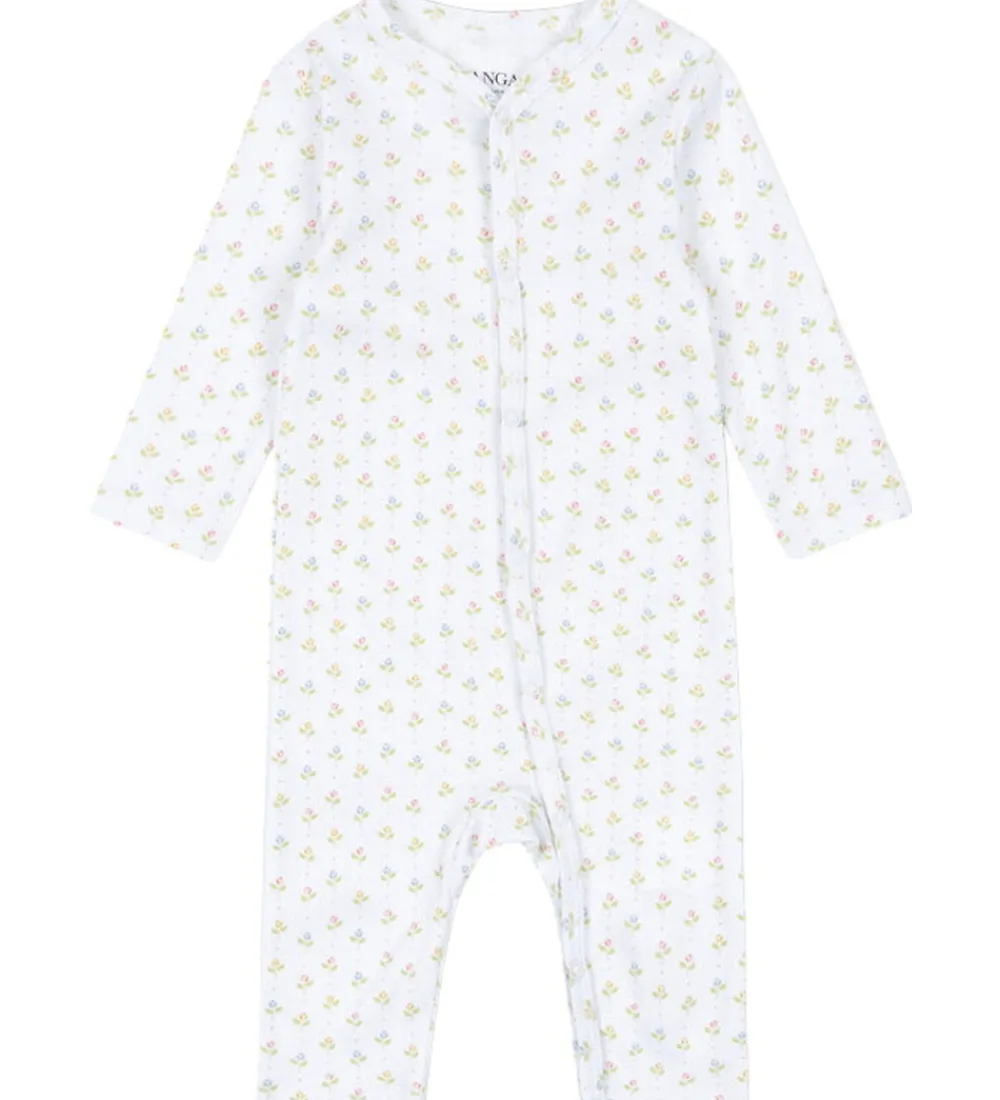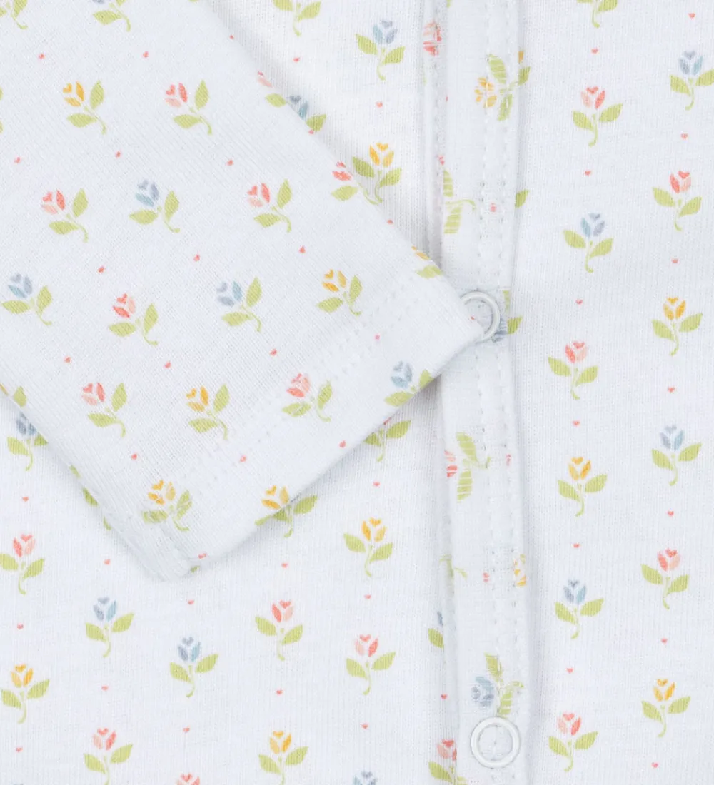 Skøn natdragt fra Fanga Fontana med lange ærmer i hvid og med et farverigt blomstermønster. Natdragten har en praktisk, asymmetrisk trykknaplukning foran, som gør den nem at åbne og lukke.