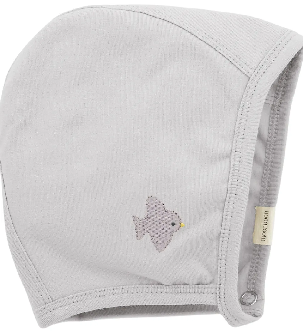 Dejlig Moonboon natdragt med babyhjelm i gråbeige med en broderet fugl. Moonboon natdragten med babyhjelm leveres i en fin gaveæske.