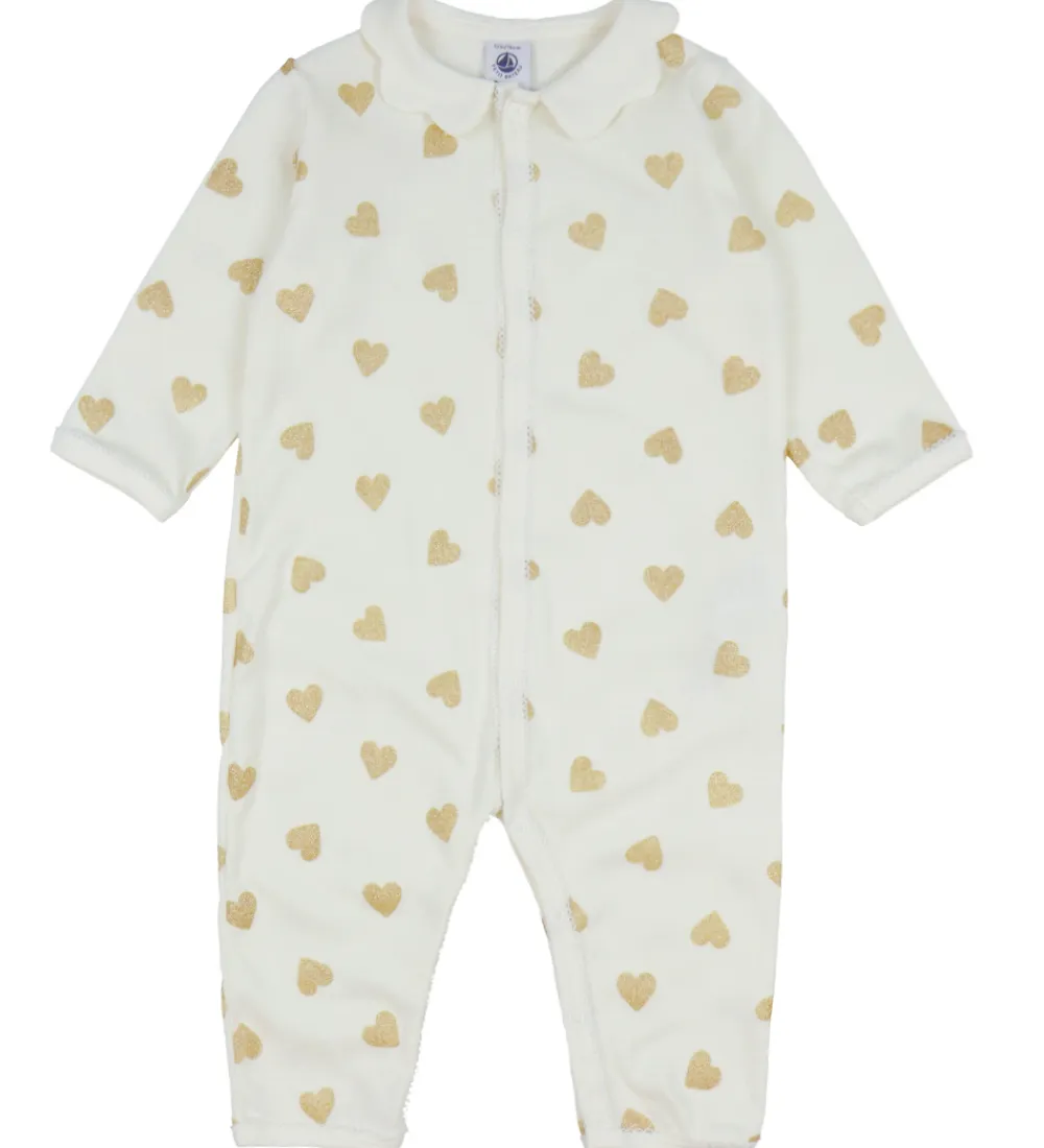 Dejlig natdragt fra Petit Bateau i en blød hvid med et alloverprint af små, gyldne glimmer hjerter. Den er udstyret med søde blondedetaljer omkring åbningerne.