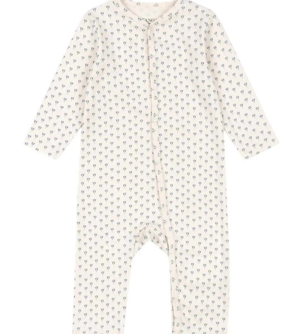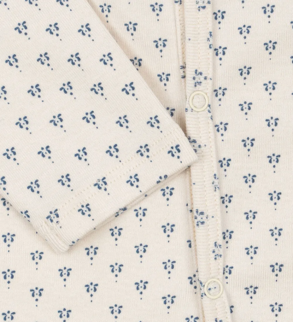 Natdragten har et diskret mønster med små, blå motiver. Den åbnes foran og mellem benene med praktiske trykknapper. Fanga Fontanas design sikrer en fin kombination af funktionalitet og stil.