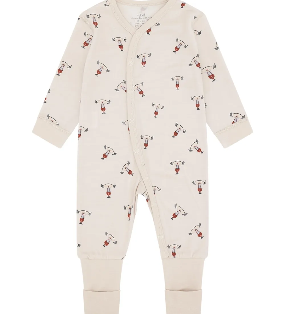 Sjov Hust and Claire natdragt i lys beige med et alloverprint af små vægtløftere. Natdragten har lange ærmer og lukkes foran med praktiske trykknapper fra hagen til venstre fod. Natdragten har lange ben med brede ribkanter og mulighed for ombuk til lukkede fødder. Den er fremstillet i en blød kvalitet af uld og bambus viskose.