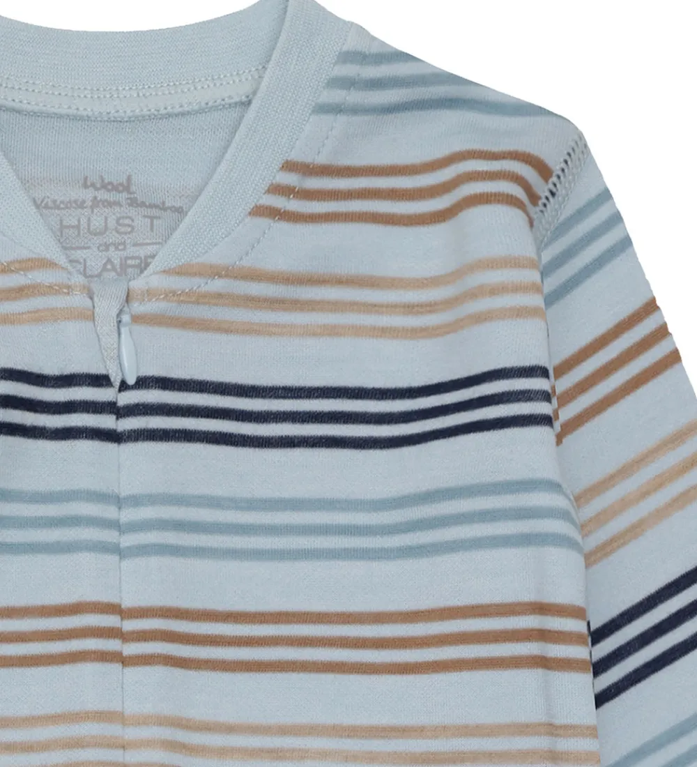 Flot natdragt fra Hust and Claire i lyseblå med stribet design i brune og blå nuancer. Natdragten har en lynlås fra hagen til venstre fod. Den har lange ærmer og lange ben med ribkanter og mulighed for ombuk til lukkede fødder. Natdragten er fremstillet i en blød blanding af uld og bambus viskose.