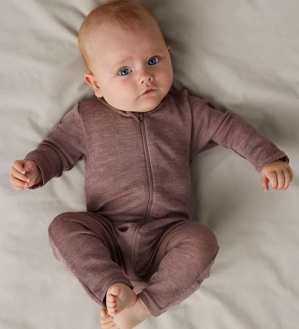 Dejlig Name It natdragt i støvet lilla med fint hulmønster og blonder i hals- og ærmeåbninger. Natdragten har en rund halsudskæring og lynlås fortil med hagesbeskytter og indvendig vindstolpe. Natdragten har lange ærmer og lange ben med mulighed for ombuk til lukkede fødder.