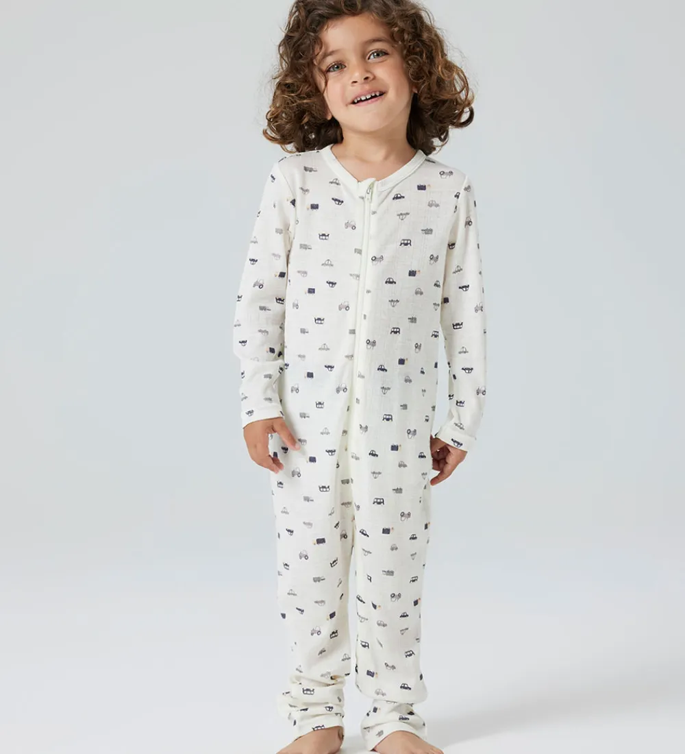 Sød Name It natdragt i hvid med print af små biler i blå og grå nuancer og med fin ribstruktur. Natdragten har en rund halsudskæring og lynlås fortil med hagesbeskytter og indvendig vindstolpe. Natdragten har lange ærmer og lange ben med mulighed for ombuk til lukkede fødder. Den er fremstillet i blødt og åndbart merinould.