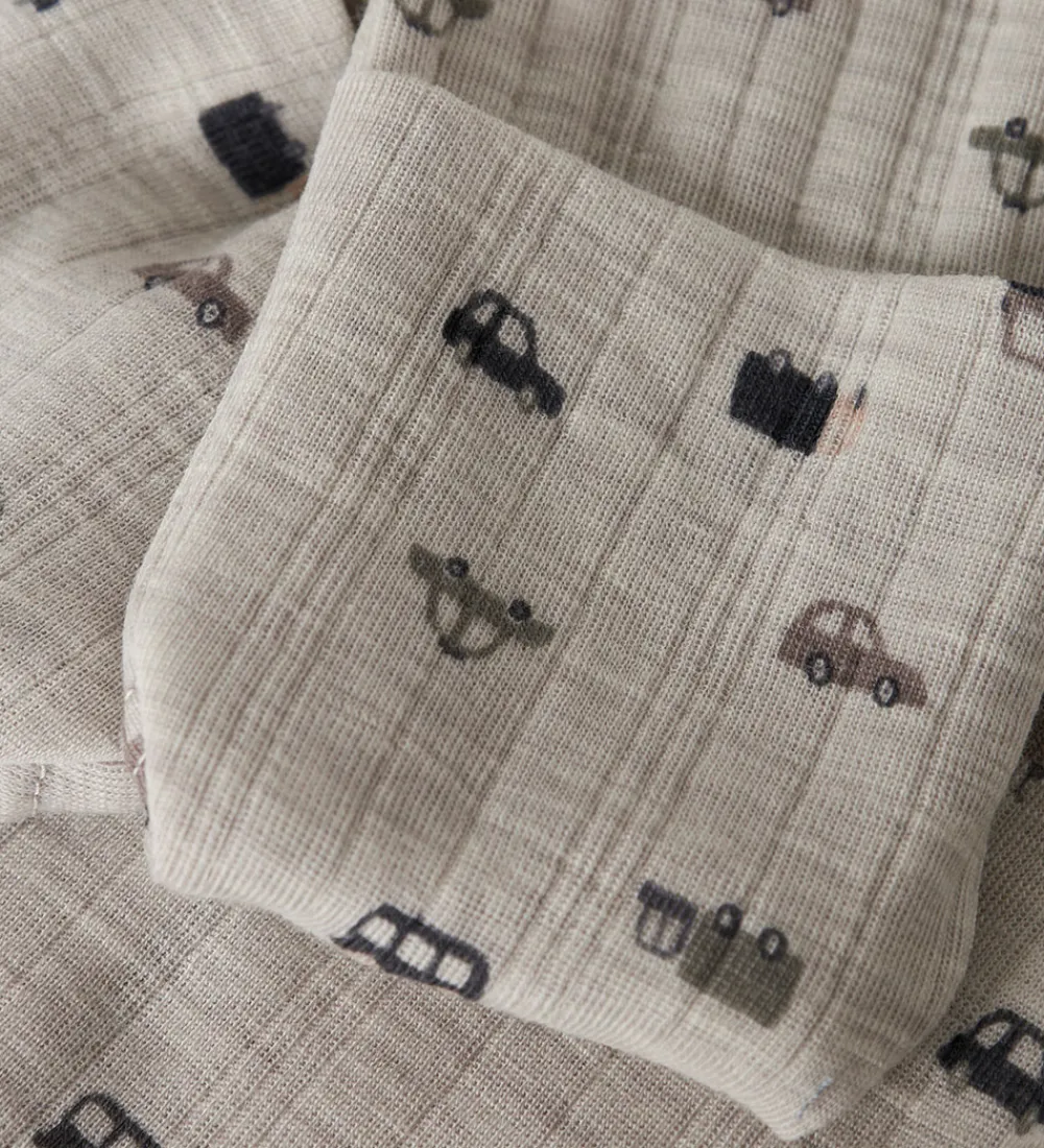 Charmerende Name It natdragt i en lys beige farve. Natdragten har et gennemgående print med små køretøjer i forskellige farver. Natdragten åbnes praktisk med en lynlås med hagebeskytter foran, der gør det nemt at klæde af og på. Natdragten er fremstillet af lækkert merinould.