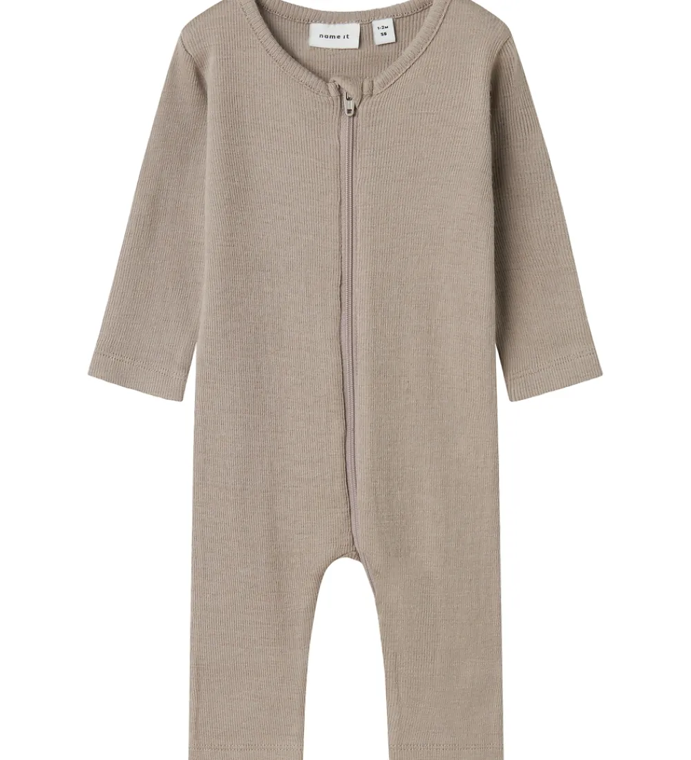Praktisk Name It natdragt i en neutral, mørkebeige nuance. Natdragten har en enkel ribstruktur med lange ærmer og er udstyret med en lynlås fortil, som gør den nem at åbne og lukke. Derudover har den ombuk ved fødderne.
