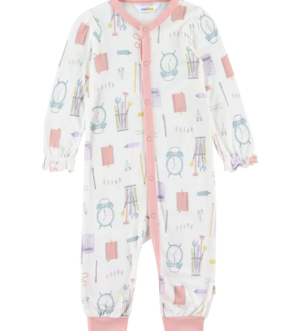 Charmerende Joha natdragt i hvid med rosa kanter og et print af farverige skriveredskaber. Natdragten har en rund halsudskæring med trykknapper fra hagen til venstre fod. Den har lange ærmer med elastik ved håndleddene og bølgede kanter.