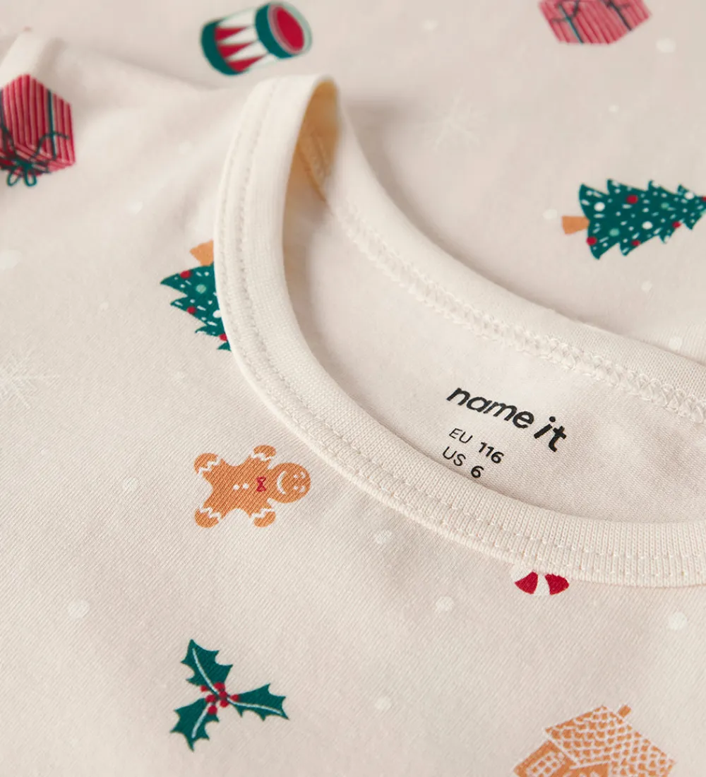 Fortryllende Name It natkjole i råhvid med et alloverprint af julemotiver. Natkjolen har en rund halsudskæring og lange ærmer. Den er fremstillet i en blød og let kvalitet.