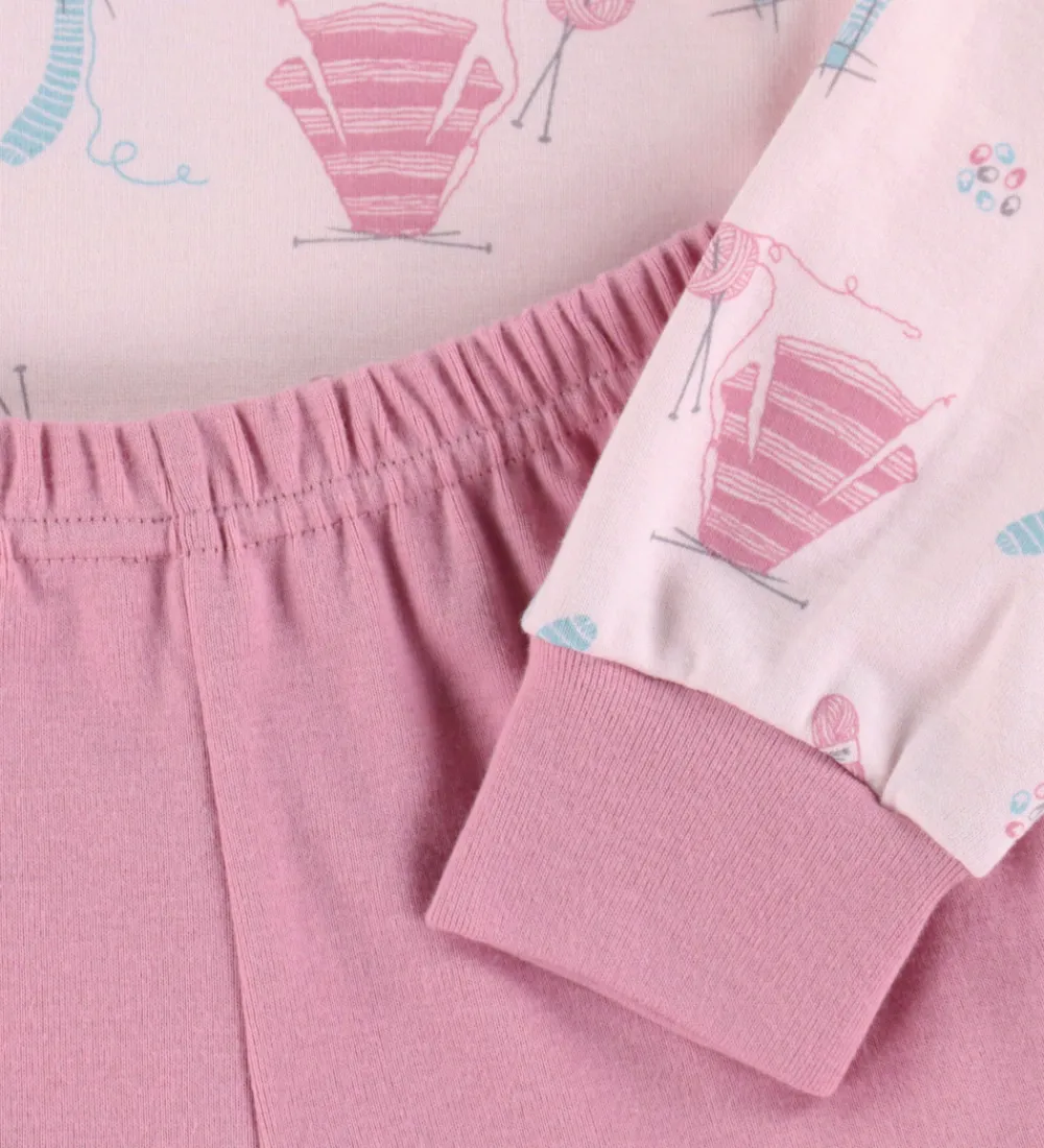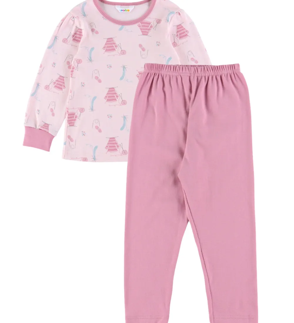 Skønt Joha nattøj bestående af en natbluse og et par natbukser. Natblusen er lys rosa med print med strikketema og mørkere rosa kanter. Den har en rund halsudskæring og lange ærmer med puf ved skuldrene og brede ribkanter. Natbukserne er mørk rosa. De har en god elastik i taljen, som giver en god pasform.