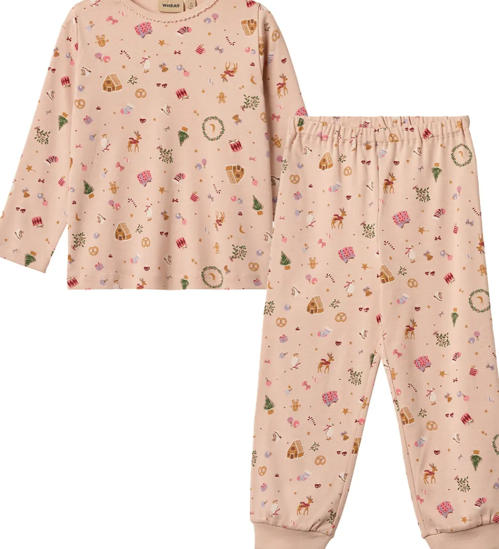 Fint Wheat nattøj bestående af bluse og bukser i lys rosa og med et detaljeret og farverigt print af forskellige julemotiver som rensdyr, gaver og juletræer. Natblusen har et minimalistisk design med en smal blondekant langs halsudskæringen. Natbukserne er med elastik i taljen og med brede ribkanter ved anklen, der sikrer en god og behagelig pasform.