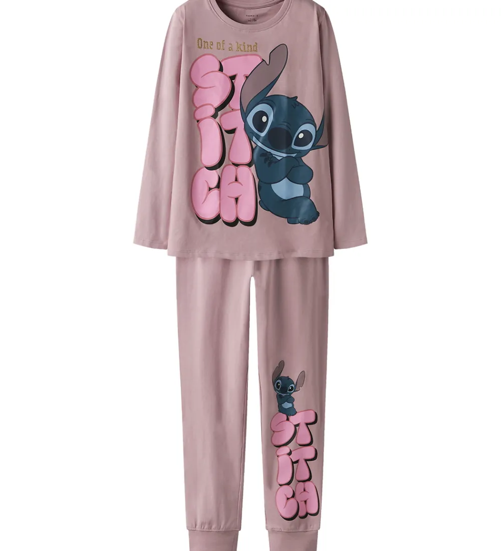 Skønt Name It nattøj bestående af en langærmet natbluse og et par natbukser i rosa med stort Stitch-print. Natblusen har en rund halsudskæring med en smal ribkant. Natbukserne har en god elastik i taljen og ribkanter ved anklerne.