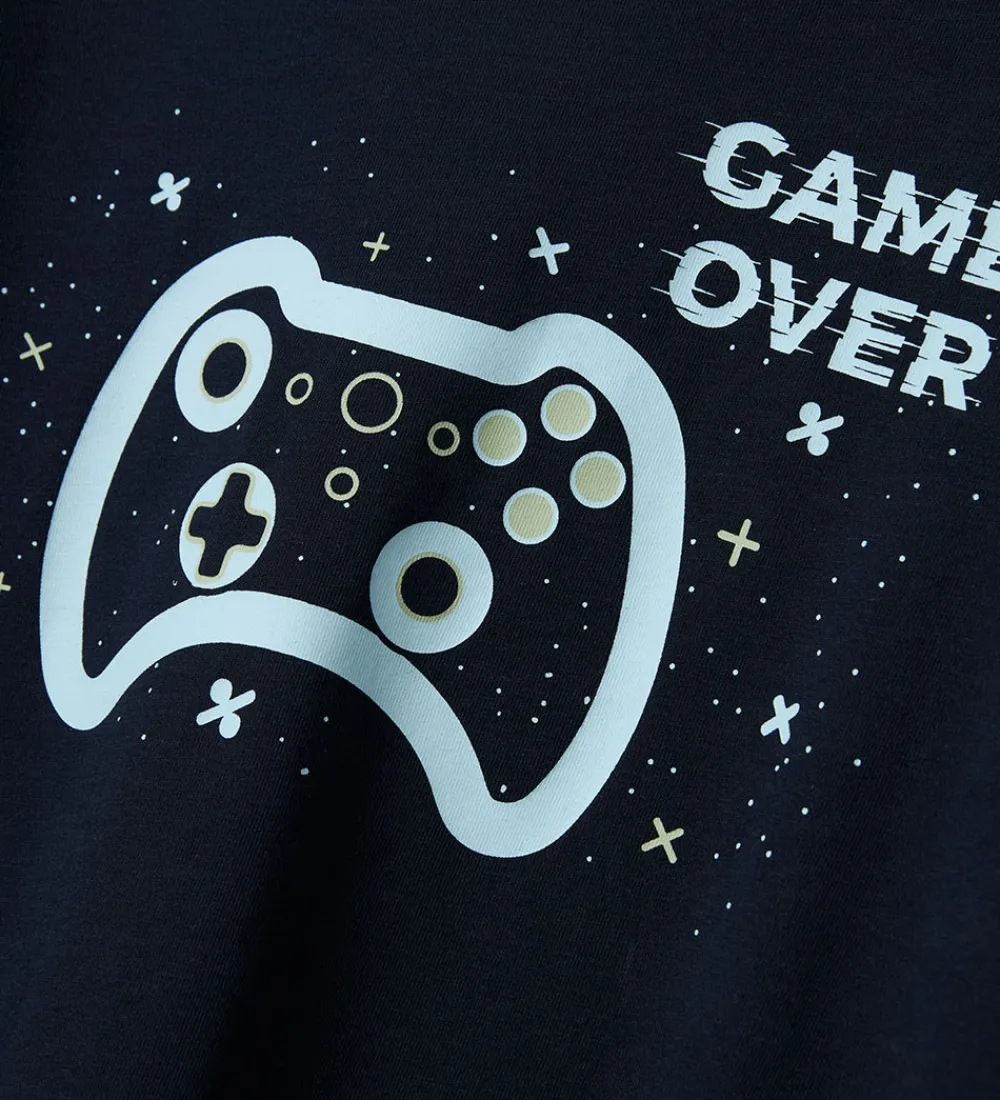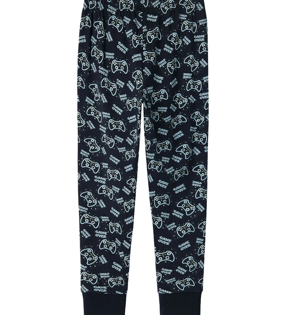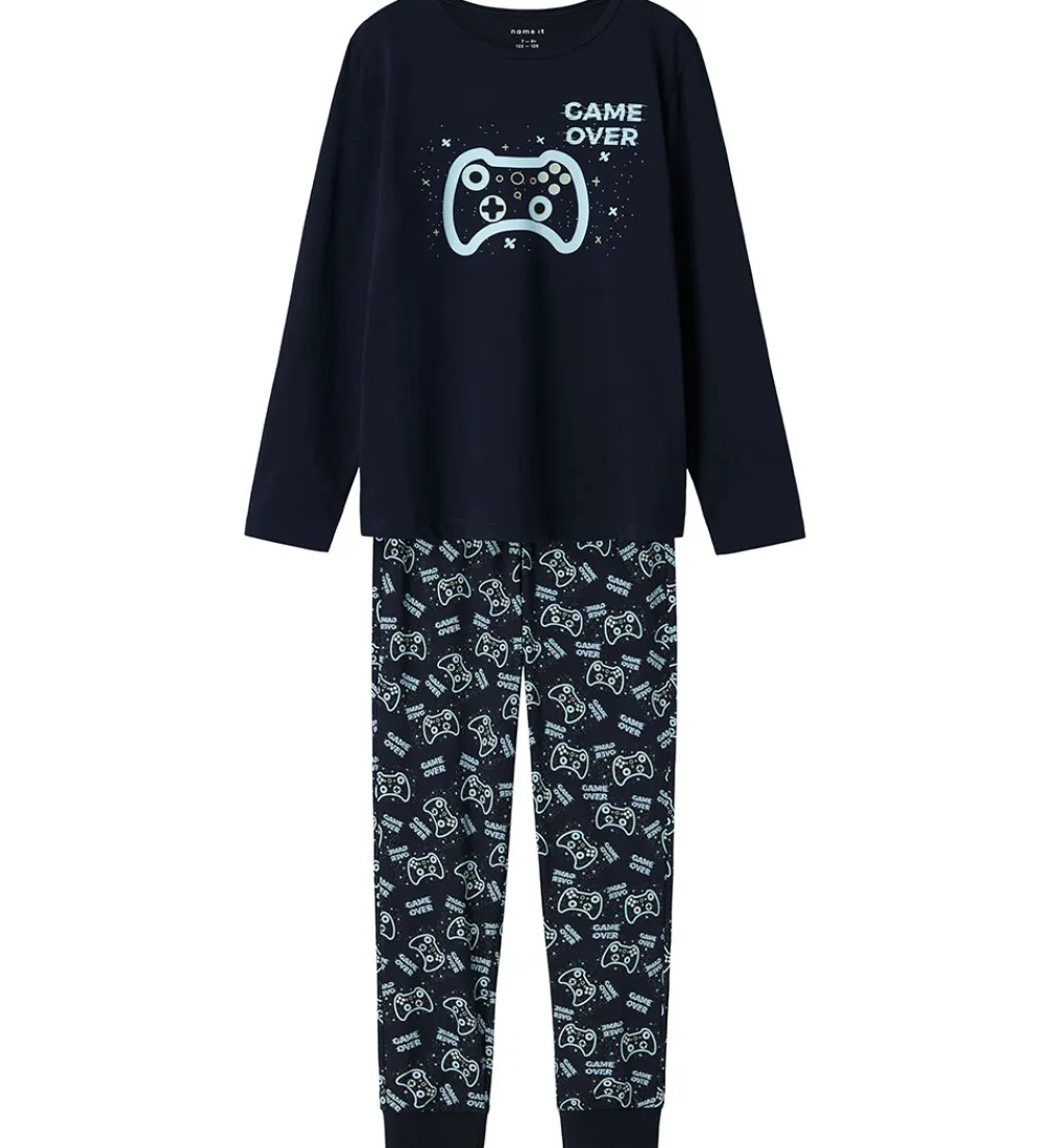 Skønt Name It nattøj, som er 2-delt med en natbluse i navyblå med et gaverprint på fronten samt et par natbukser i navyblå med et allover-gamerprint, der sikrer en god nat.