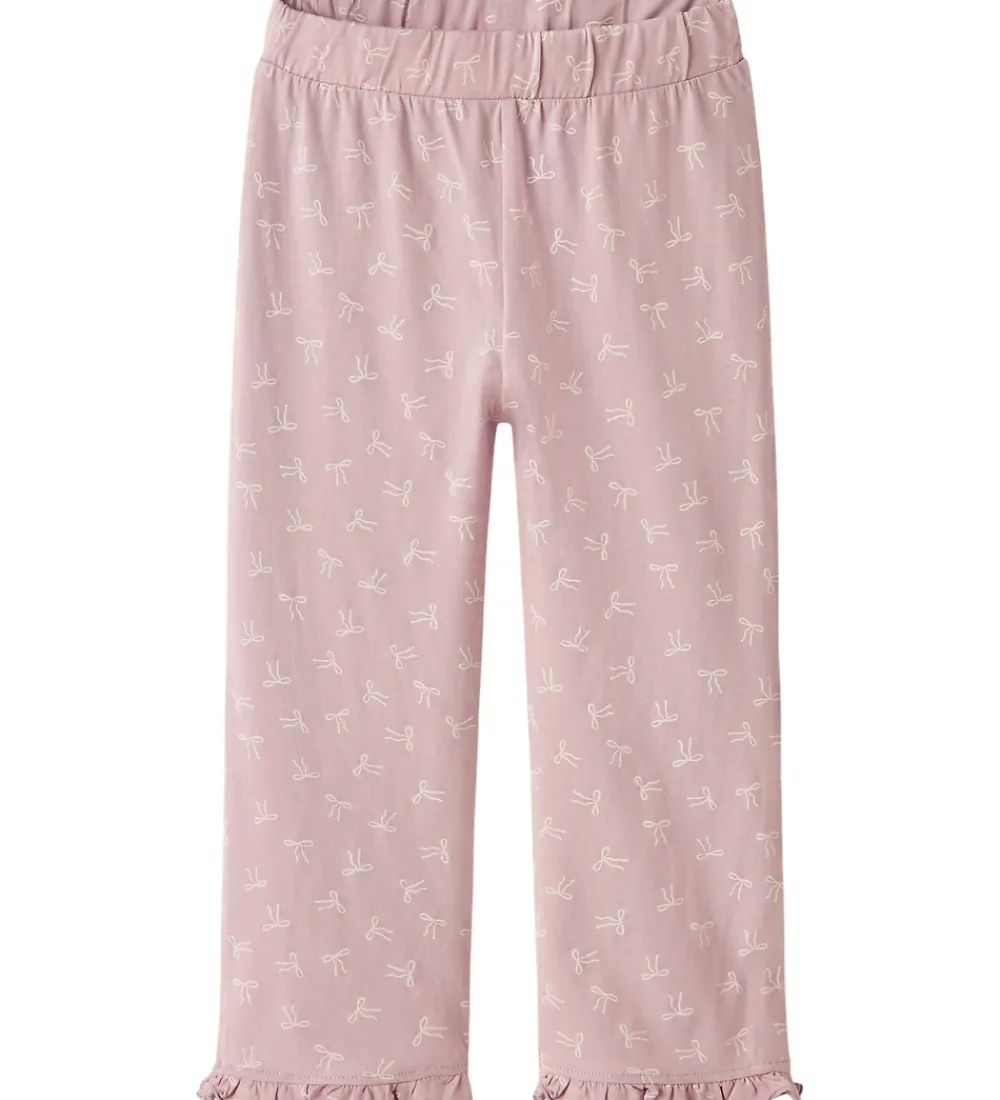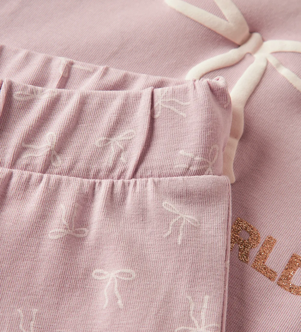 Skønt Name It nattøj 2-delt sæt i en smuk lyserød nuance. Blusen har lange ærmer og et charmerende print med teksten “Off To My Dream World” i guld. Bukserne er dekoreret med små sløjfeprint.