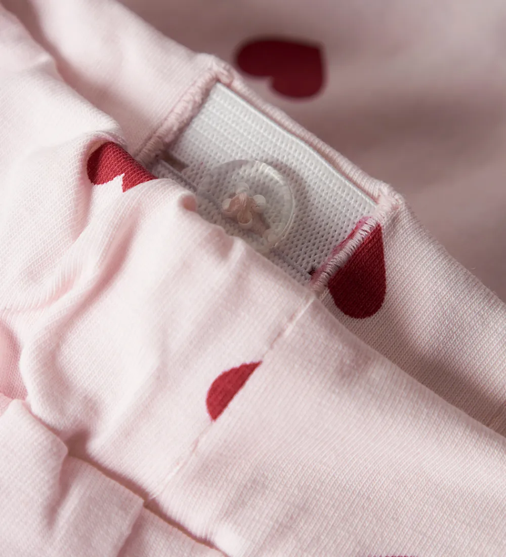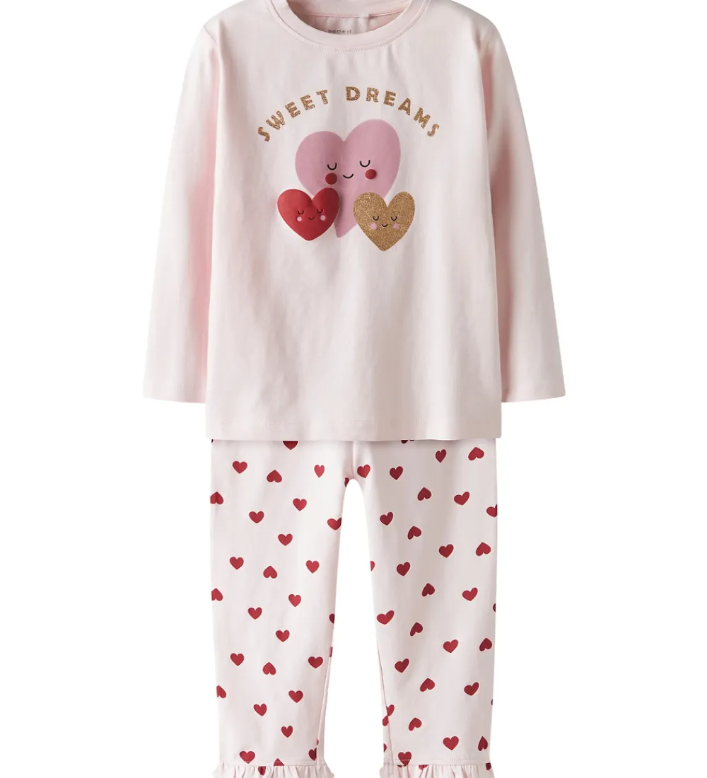 Charmerende Name It nattøj i creme med lange ærmer og fint hjerteprint. Nattøjet er todelt. Natblusen har et sødt “Sweet Dreams” print, mens bukserne prydes af små røde hjerter og flæsedetaljer ved anklerne.