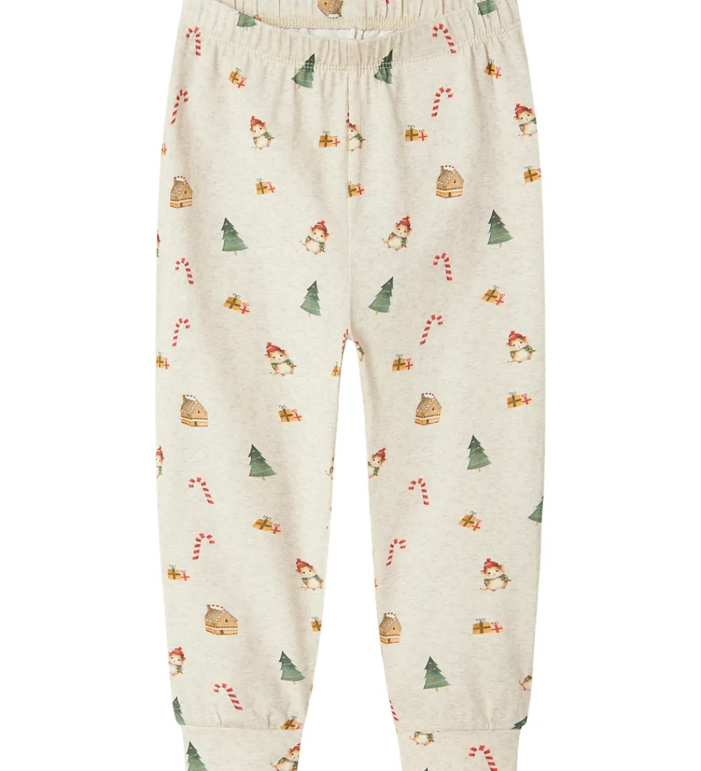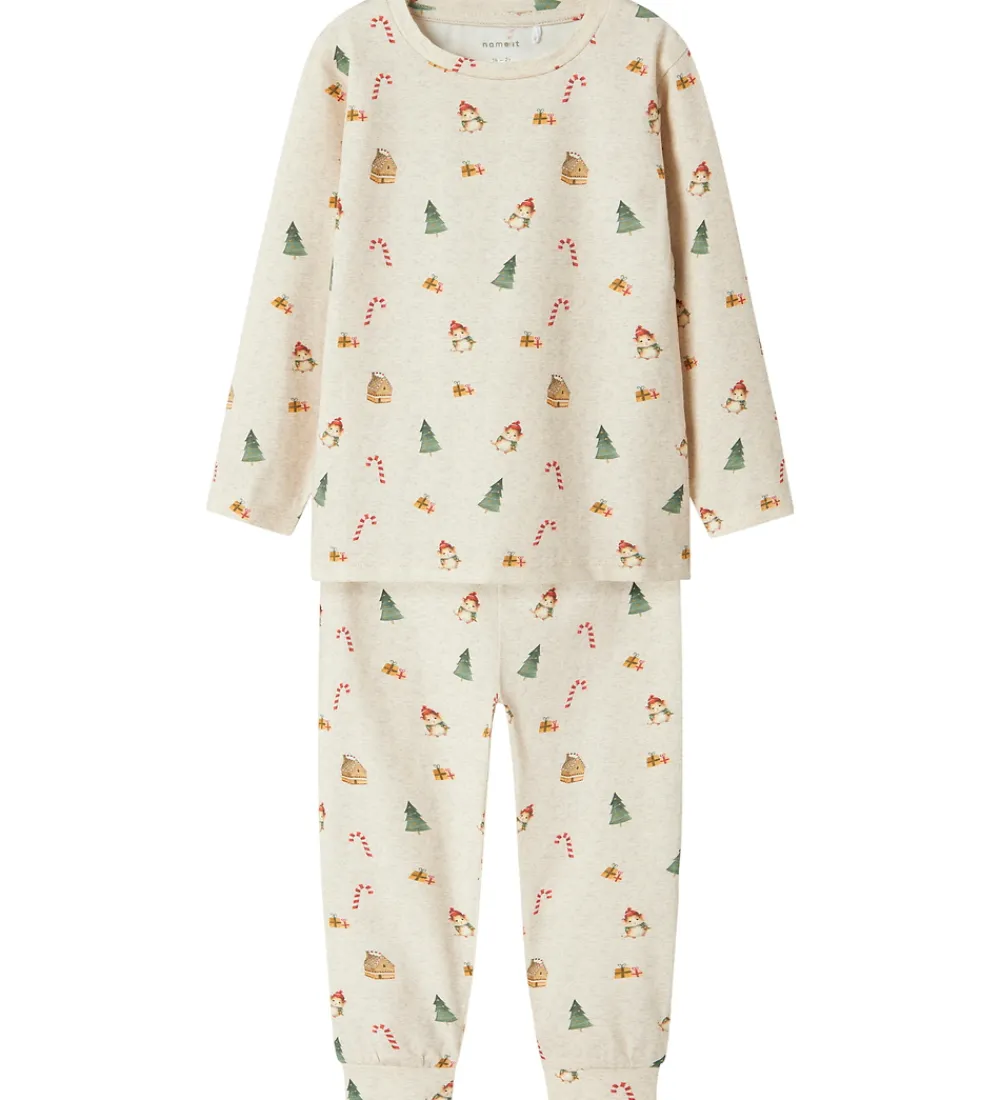 Herligt Name It nattøj i lys meleret beige med print af julemotiver, heriblant juletræer, slikstokke og gaver. Nattøjet består af en langærmet natbluse og et par natbukser med en god elastik i taljen og brede kanter ved anklerne.