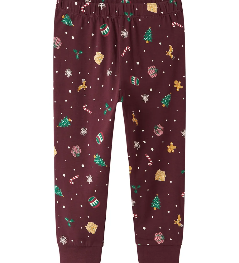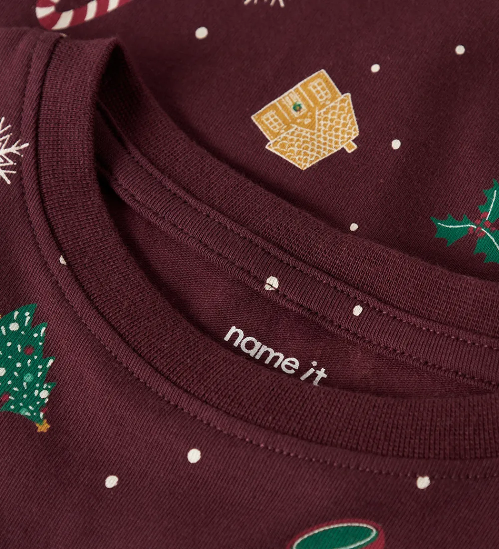Skønt Name It nattøj bestående af en natbluse og et par natbukser i mørkerød med alloverprint af julemotiver. Natblusen har en rund halsudskæring med en smal ribkant og lange ærmer. Natbukserne har en god elastik i taljen, og i benåbningerne er der brede ribkanter.