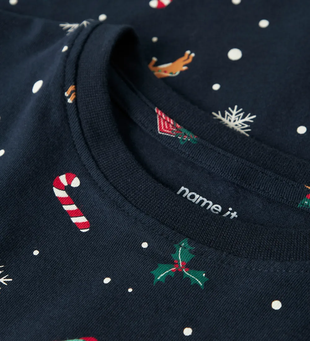 Skønt Name It nattøj bestående af en natbluse og et par natbukser i navyblå med alloverprint af julemotiver. Natblusen har en rund halsudskæring med en smal ribkant og lange ærmer. Natbukserne har en god elastik i taljen, og i benåbningerne er der brede ribkanter.