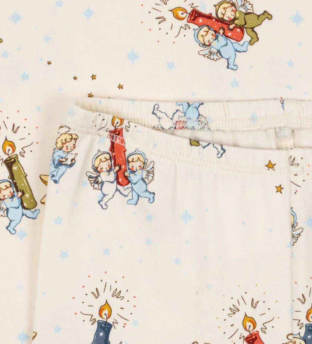 Behageligt Konges Sløjd nattøj bestående af en natbluse med lange ærmer og et par natbukser med elastisk talje i en skøn råhvid nuance. Nattøjet er dekoreret med et charmerende print af engle, stjerner og måner, der skaber et eventyrligt udtryk.