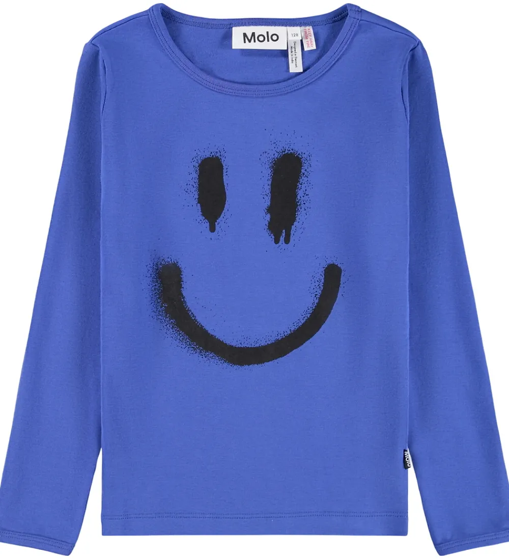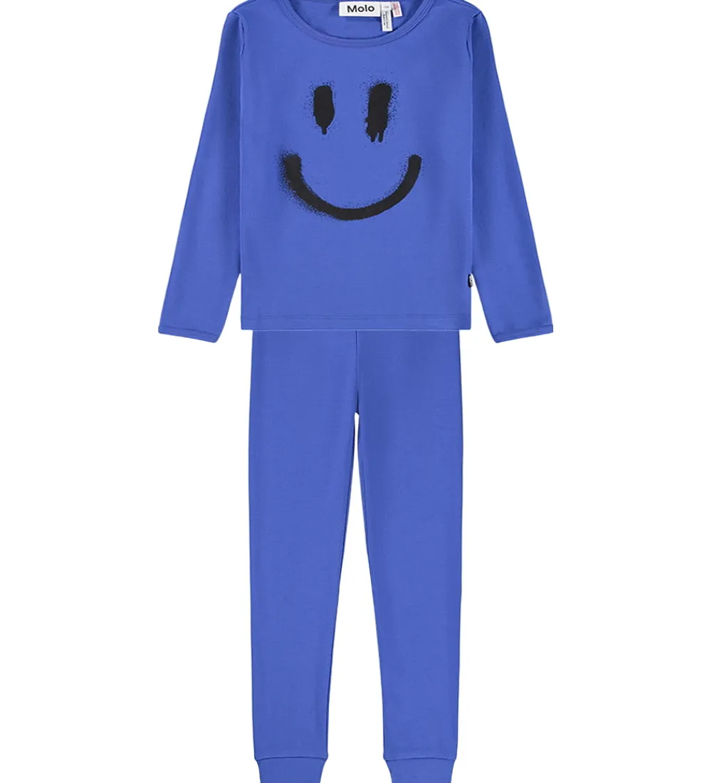 Flot Molo nattøj 2-delt i en klar blå farve. Molo nattøjet har en bluse med lange ærmer og et stort sort smileyprint på fronten, der tilføjer et sjovt element.