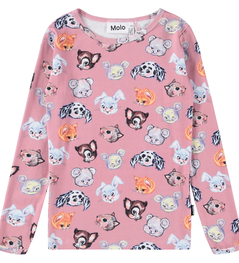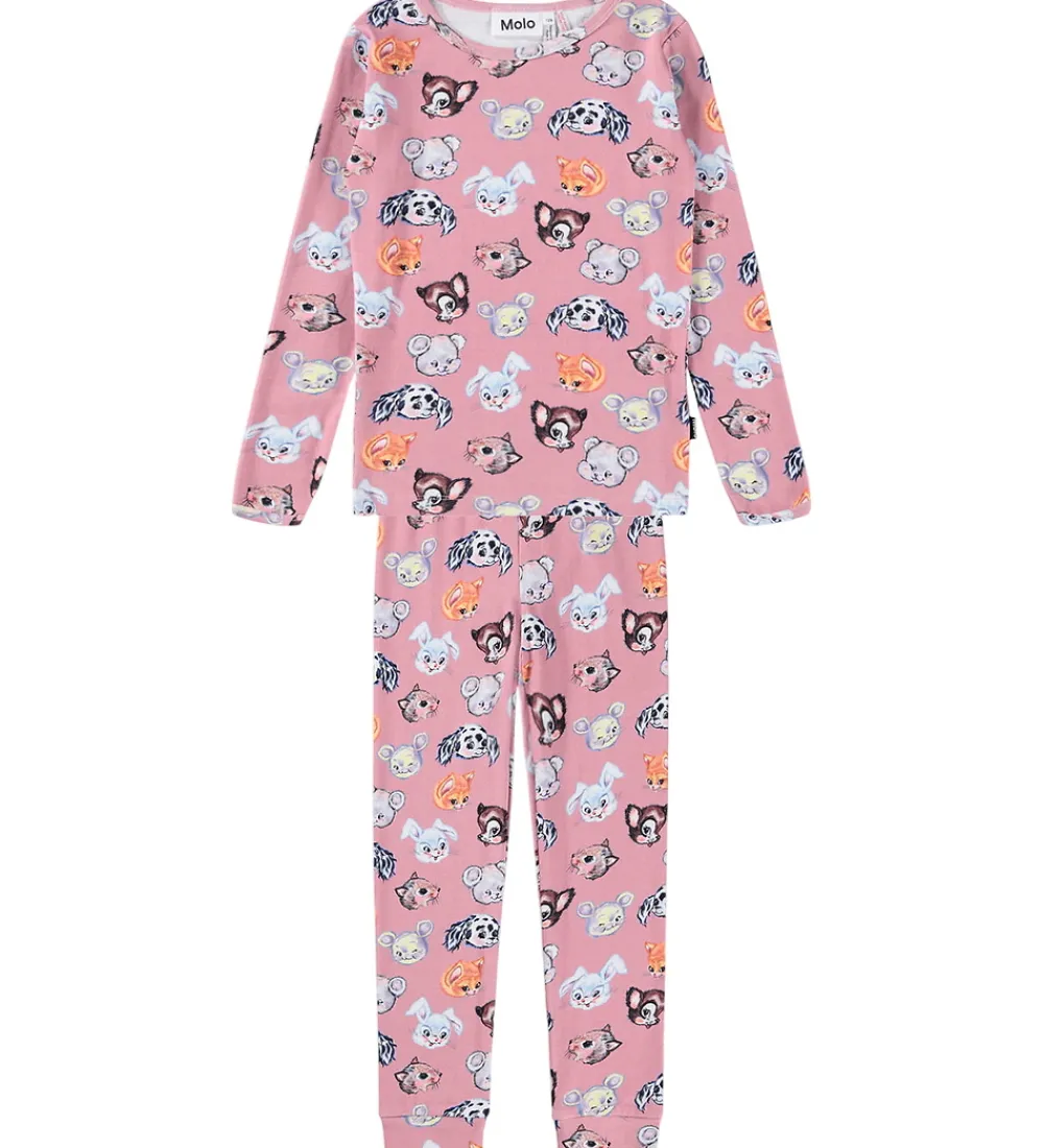 Charmerende Molo nattøj med lange ærmer i en flot rosa farve. Det er dekoreret med et skønt dyreprint, der pryder hele sættet. Molo sikrer komfort og stil i nattøjet.