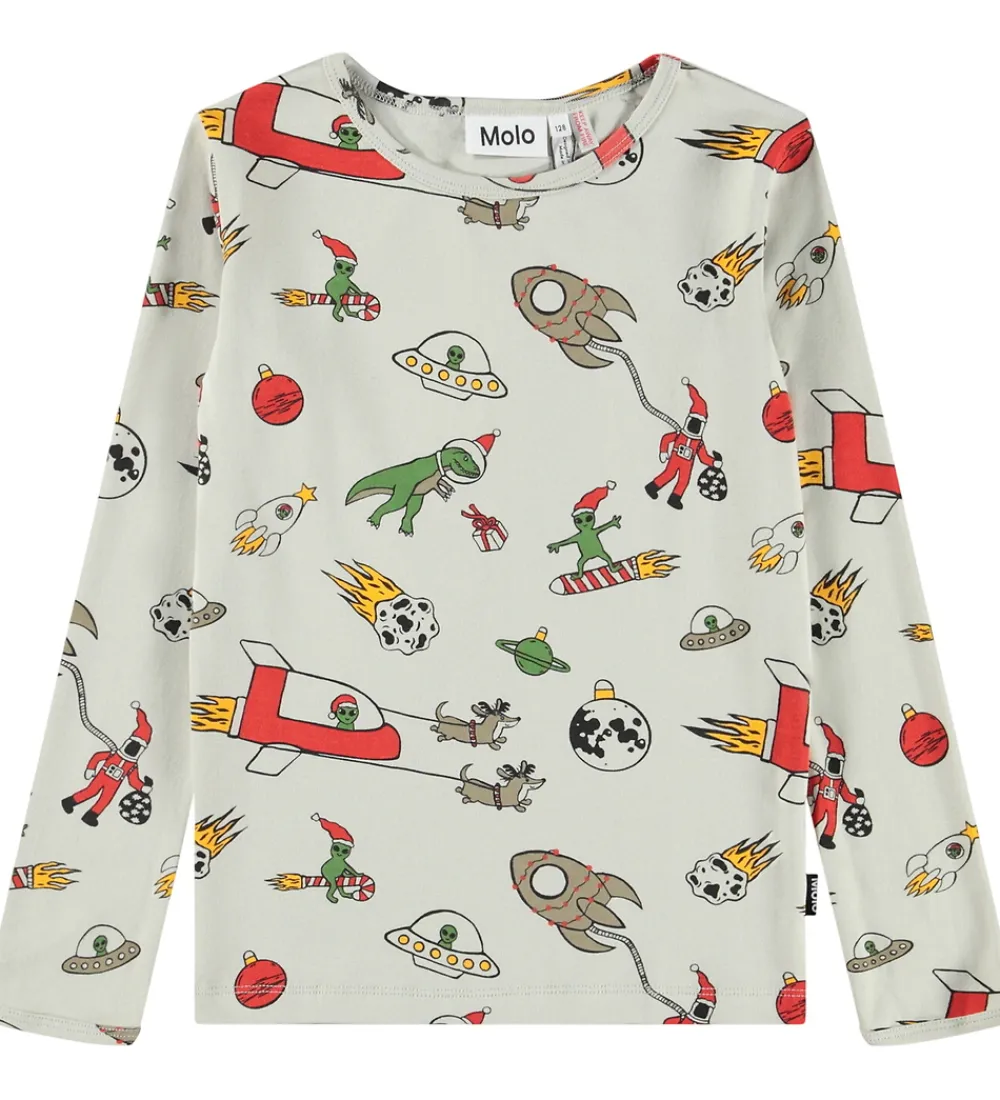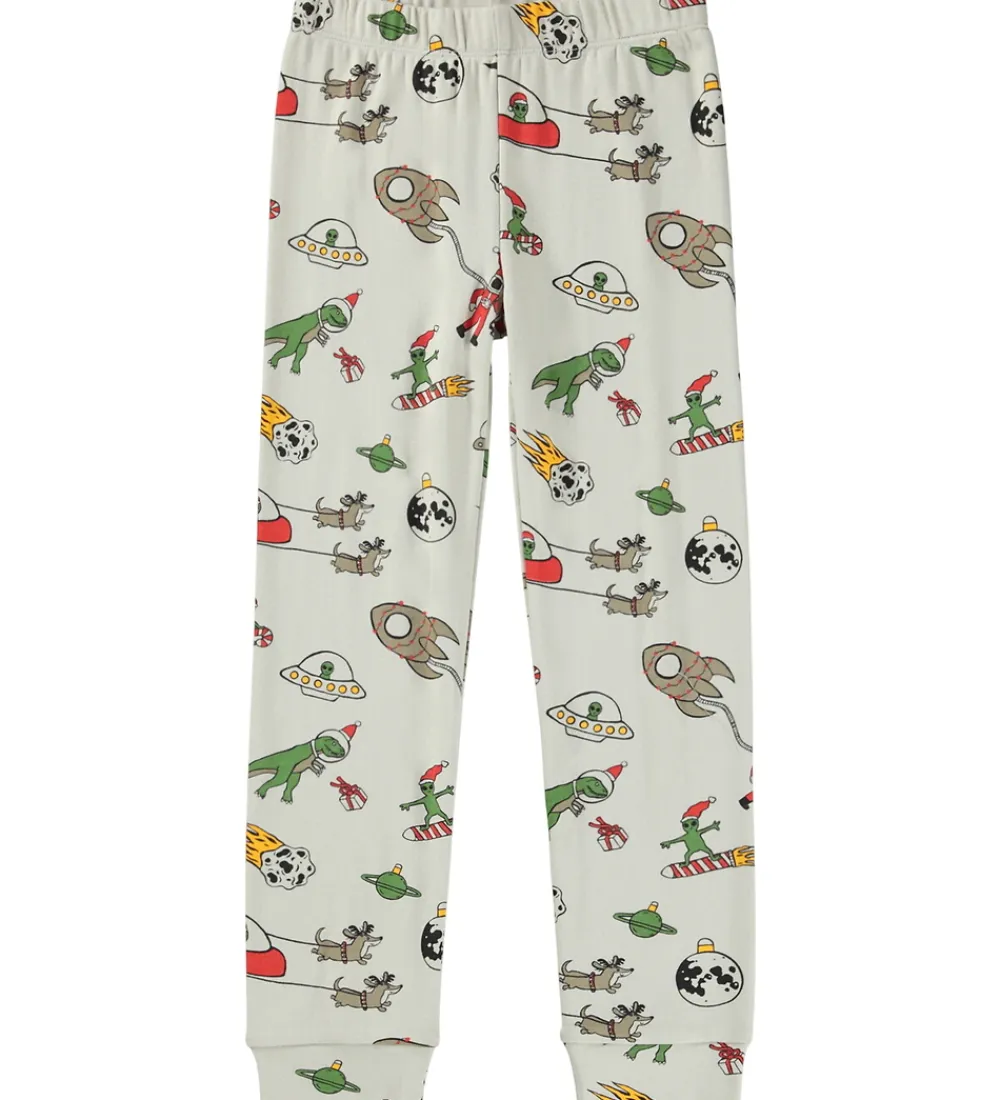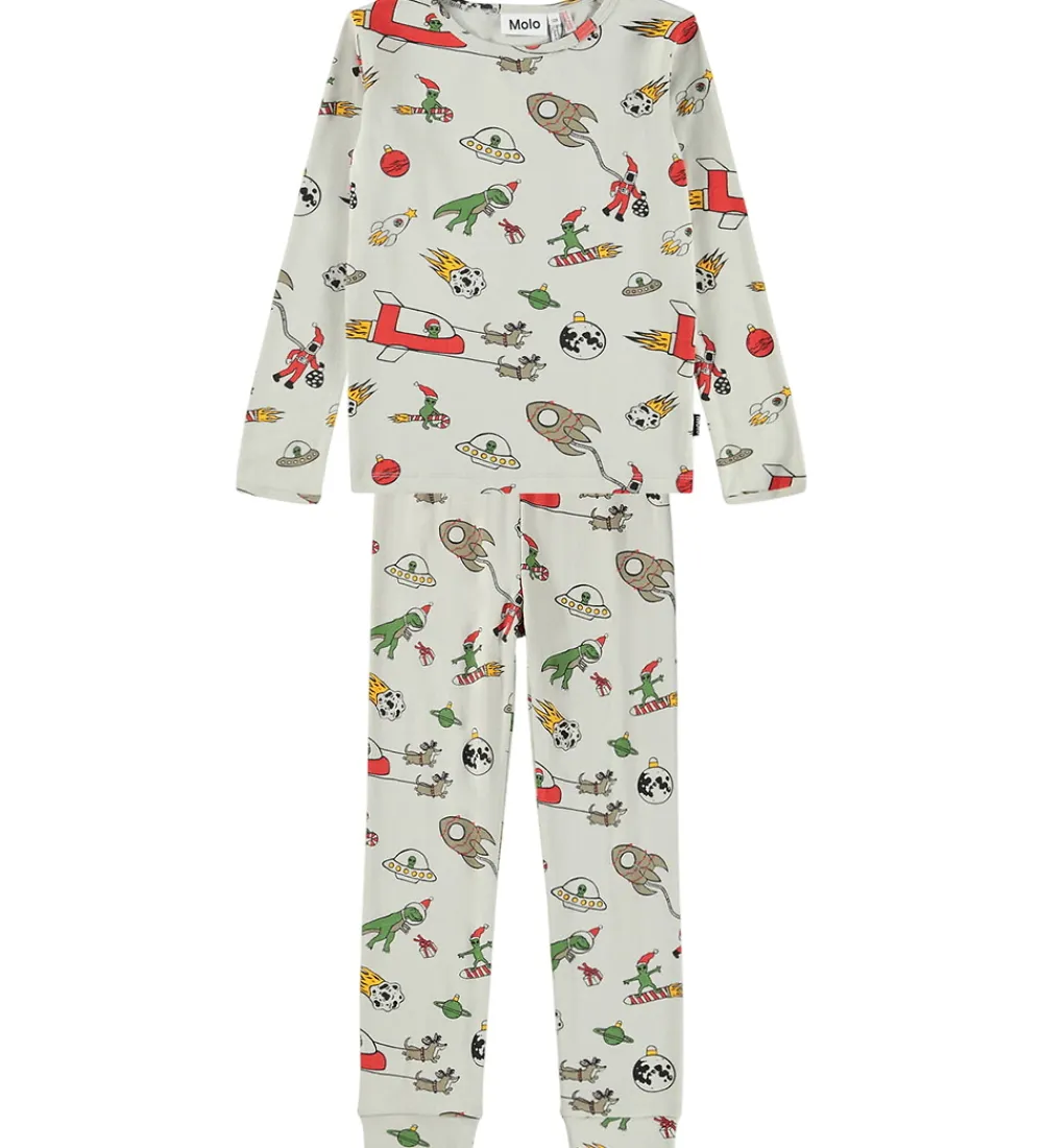 Smart Molo nattøj bestående af bluse og bukser i en lys beige nuance og med et kombineret jule- og ruminspireret print i form af bl.a. raketter, planeter, julekugler og rumvæsner med nissehue.