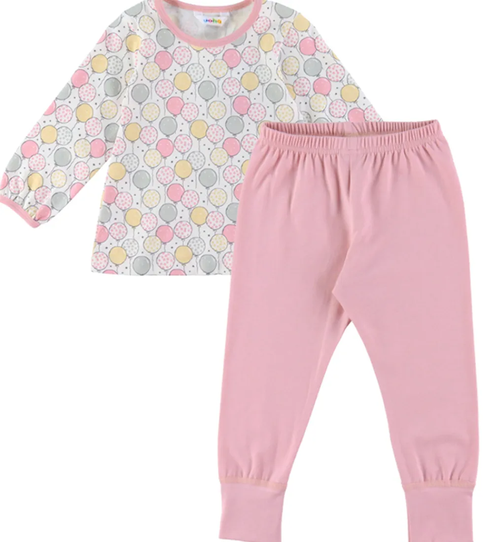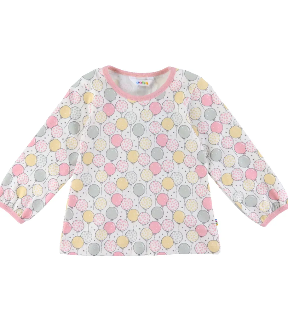 Skønt Joha nattøj 2-delt bestående af en nattrøje og et par natbukser. Nattrøjen er i hvid med et farverigt ballonprint i rosa, gul og grøn med få rosa glimmer prikker, mens bukserne har en enkel design i ensfarvet rosa. Joha kombinerer komfort og stil i dette nattøj.