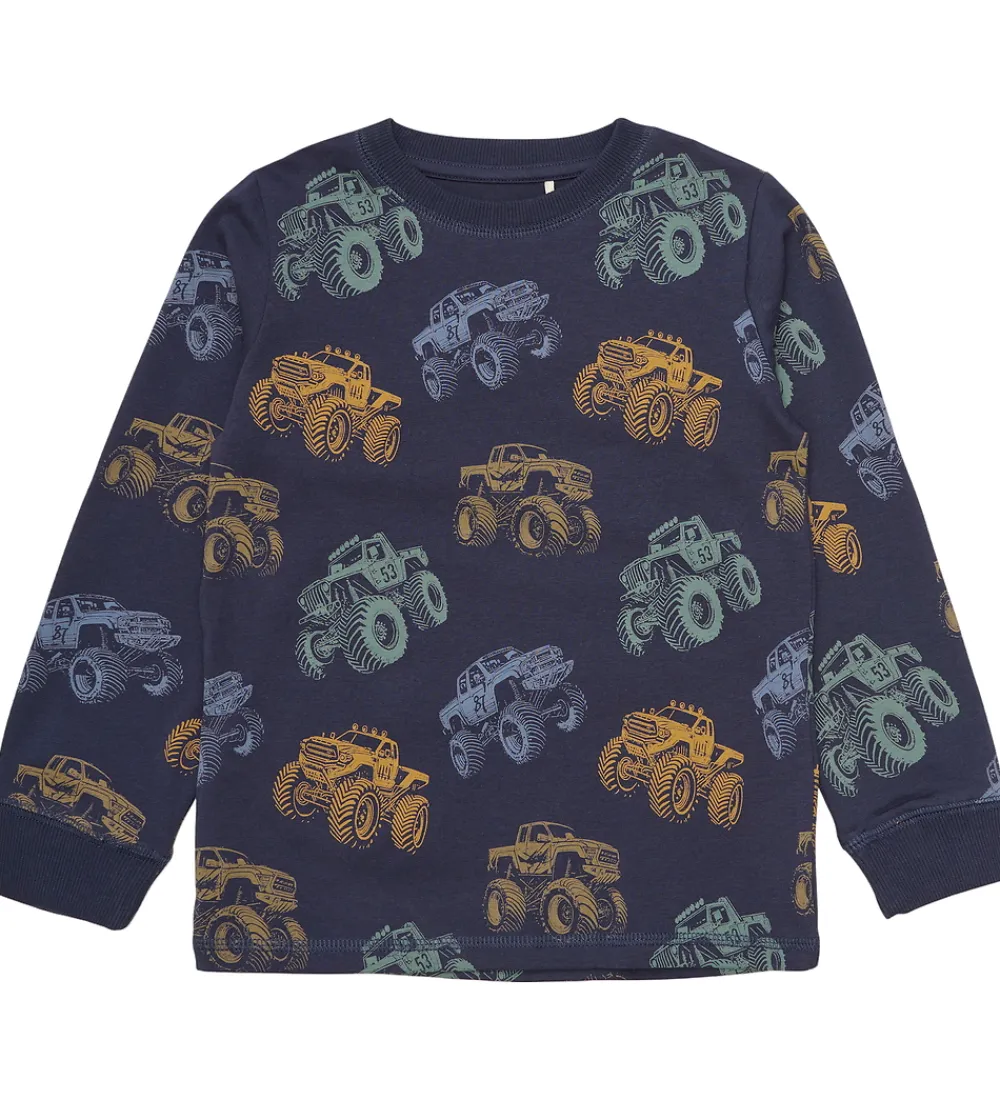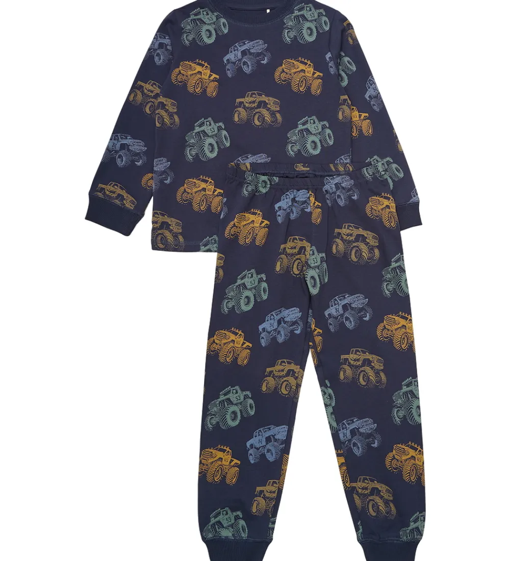 Flot Minymo nattøj 2-delt i en mørk blå nuance med et farverigt monstertruck-print. Minymo blusen har lange ærmer, der sammen med bukserne giver en behagelig pasform.