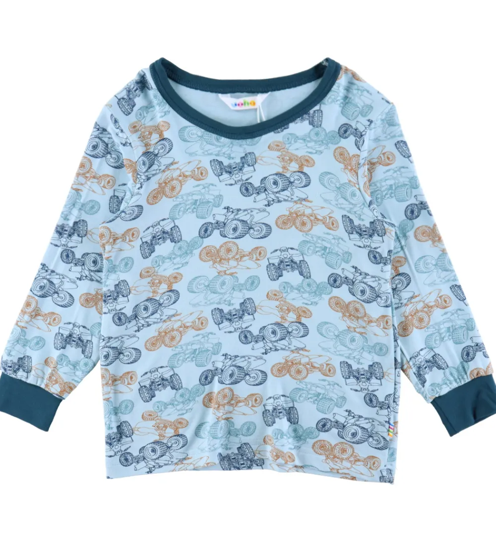 Lækker Joha nattøj bestående af en langærmet bluse og et par natbukser. Blusen er lyseblå med et alloverprint af ATV’er i blå og orange nuancer og kanter i petroliumsblå. Den har en rund halsudskæring og lange ærmer med brede kanter. Natbukserne er ensfarvet petroliumsblå med en god elastik i taljen og brede kanter i benåbningerne.