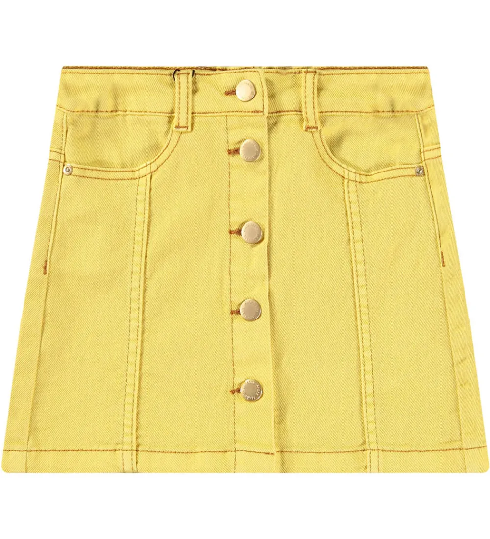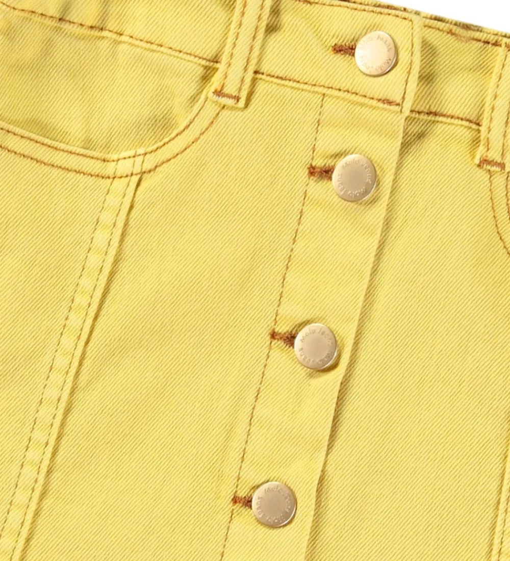 Smart Molo nederdel i en strækbar, gul denimkvalitet og med gennemgående metallic trykknapper fortil.
