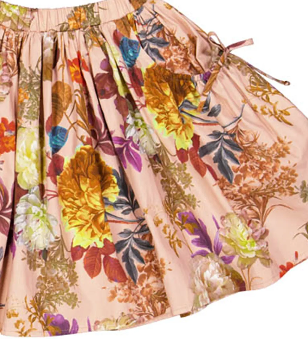 Smuk Christina Rohde nederdel i en støvet rosa nuance med et farverigt blomsterprint i varme efterårsfarver. Nederdelen har en behagelig elastikkant i taljen og fine bindebånd i siderne, som giver et flot og detaljeret look.