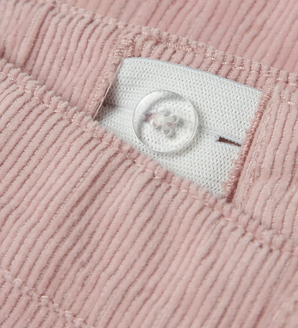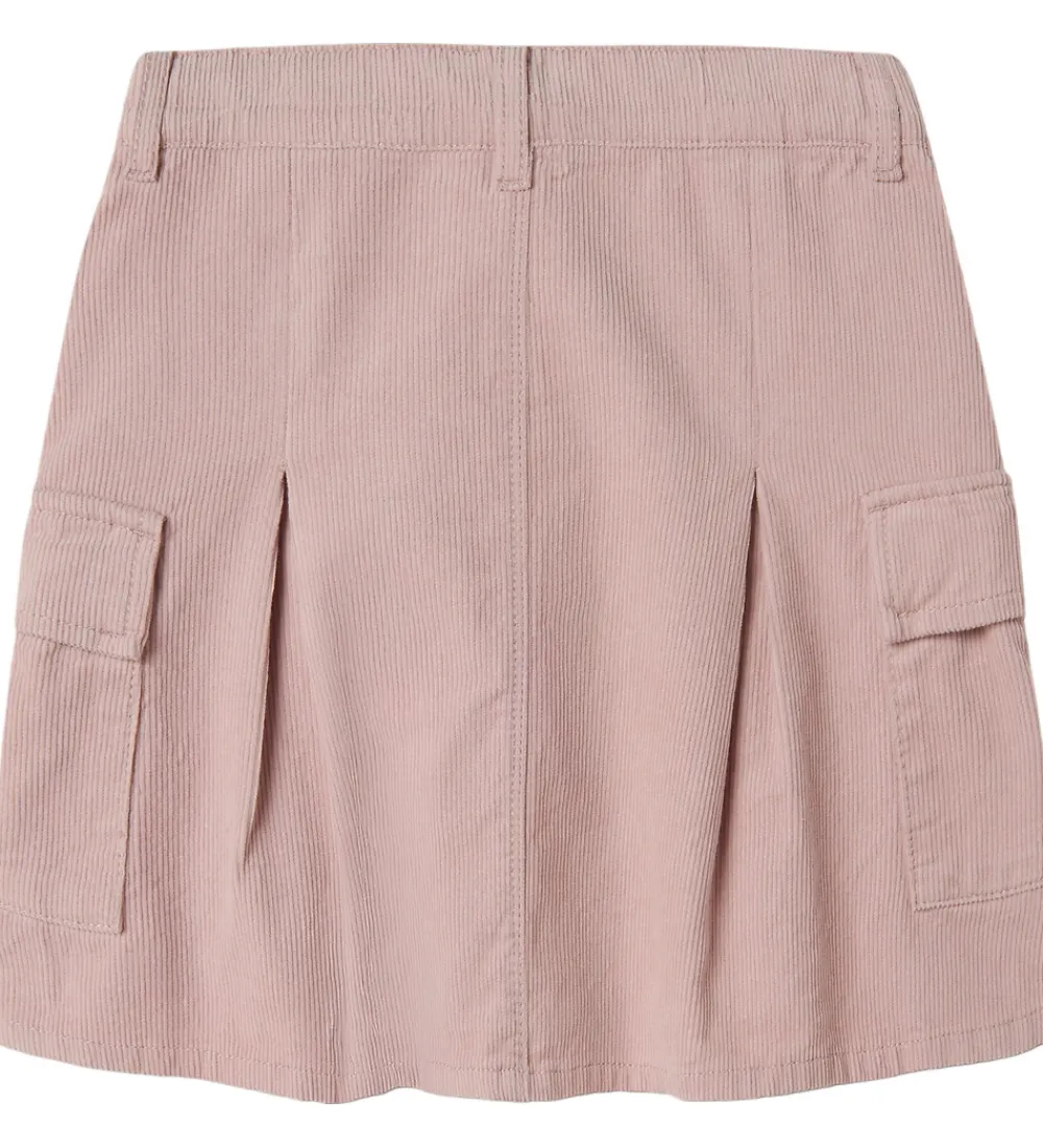 Elegant Name It nederdel i rosa fløjl. Name It nederdelen lukkes fortil med en hægte og lynlås. Den har praktiske bæltestropper og store klaplommer på siderne.