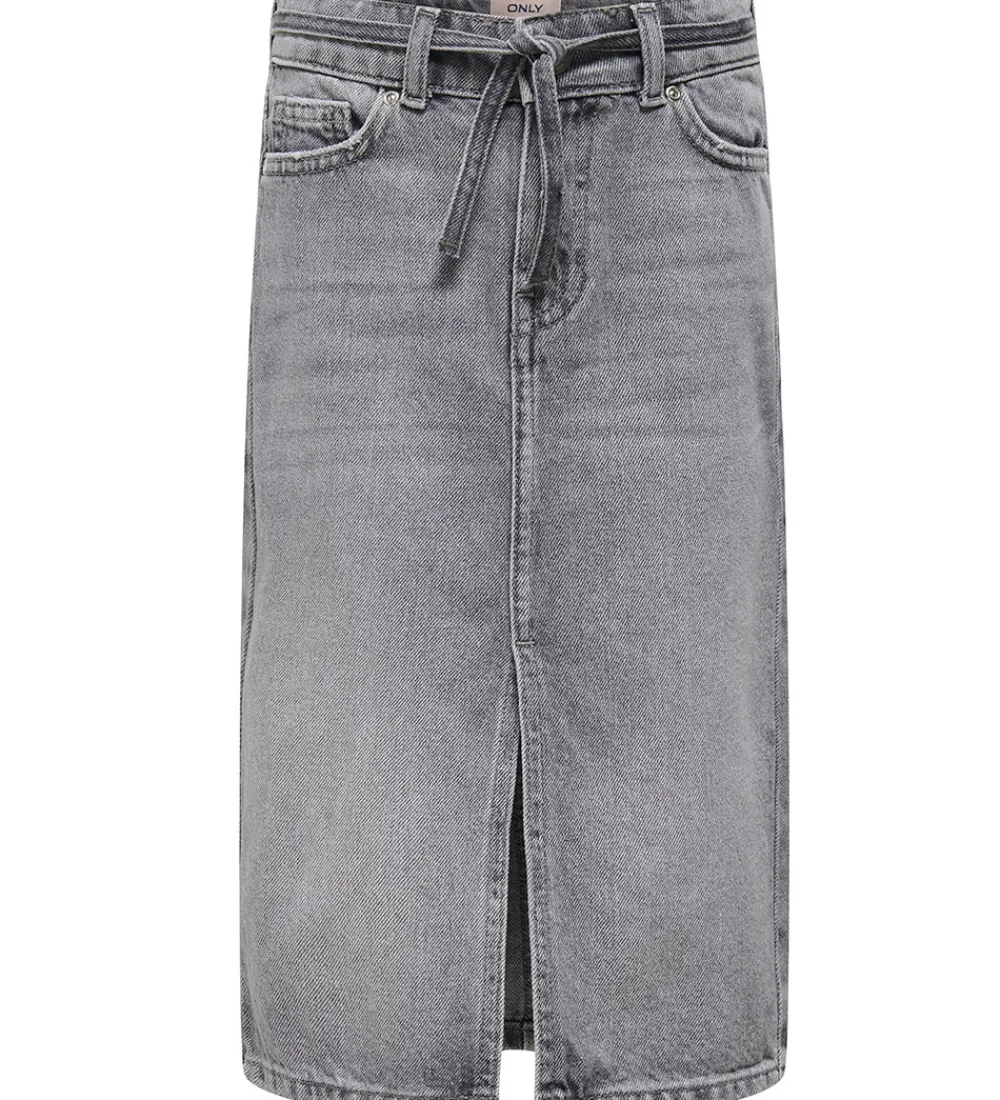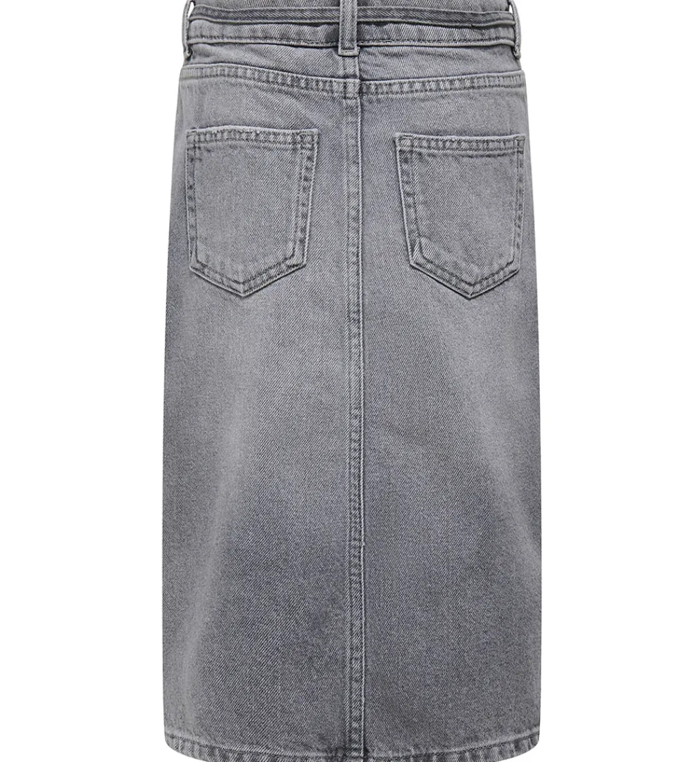 Lækker nederdel fra Kids Only i en medium grå denim. Nederdelen har en flot slids foran og bæltestropper, der bidrager til det enkle og stilfulde design.