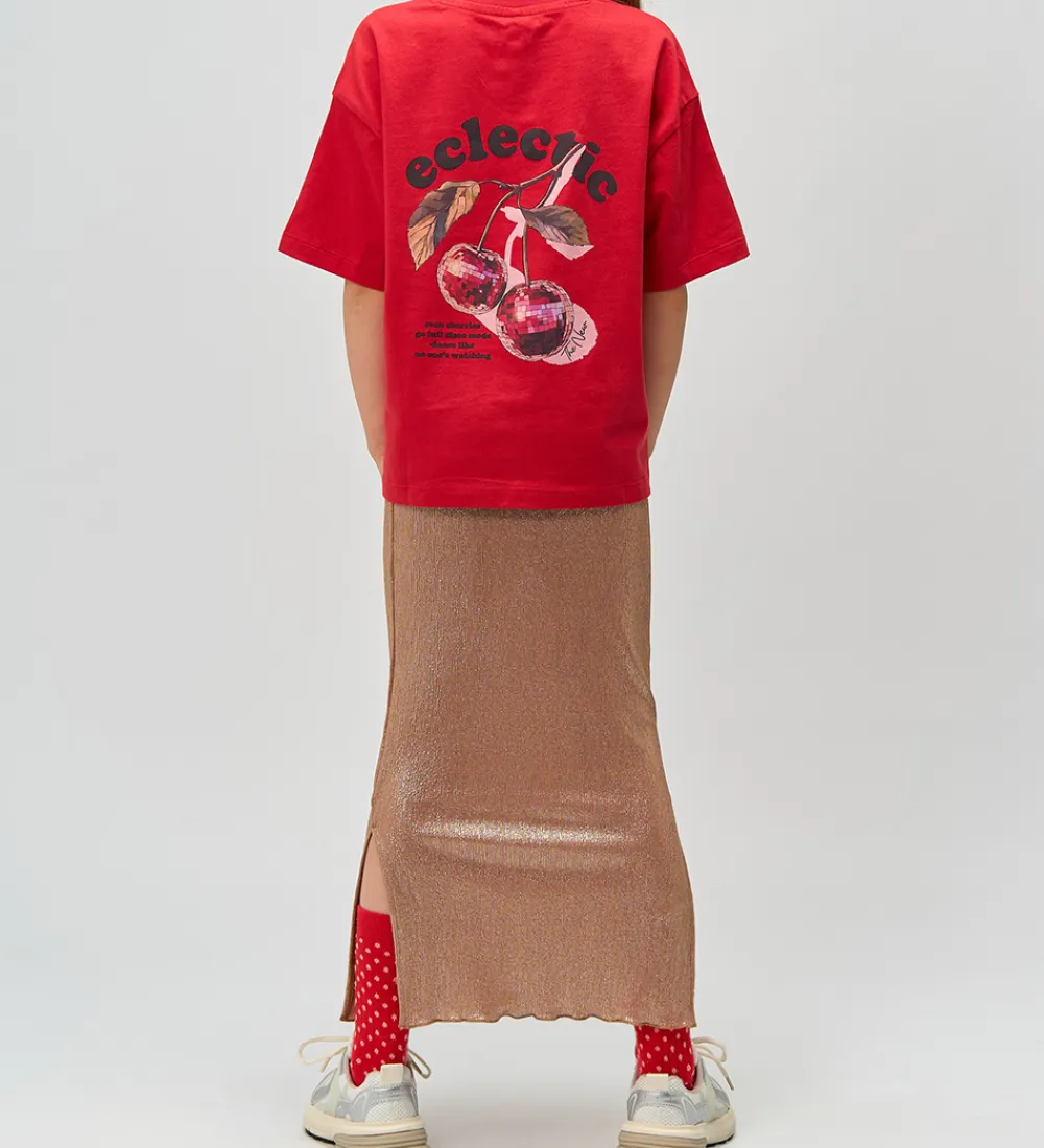 Flot The New nederdel i skinnende, metallisk guld. The New nederdelen har en tætsiddende pasform med elastik i taljen. Stoffet har en glat struktur. Den medfølgende scrunchie matcher nederdelens farve.