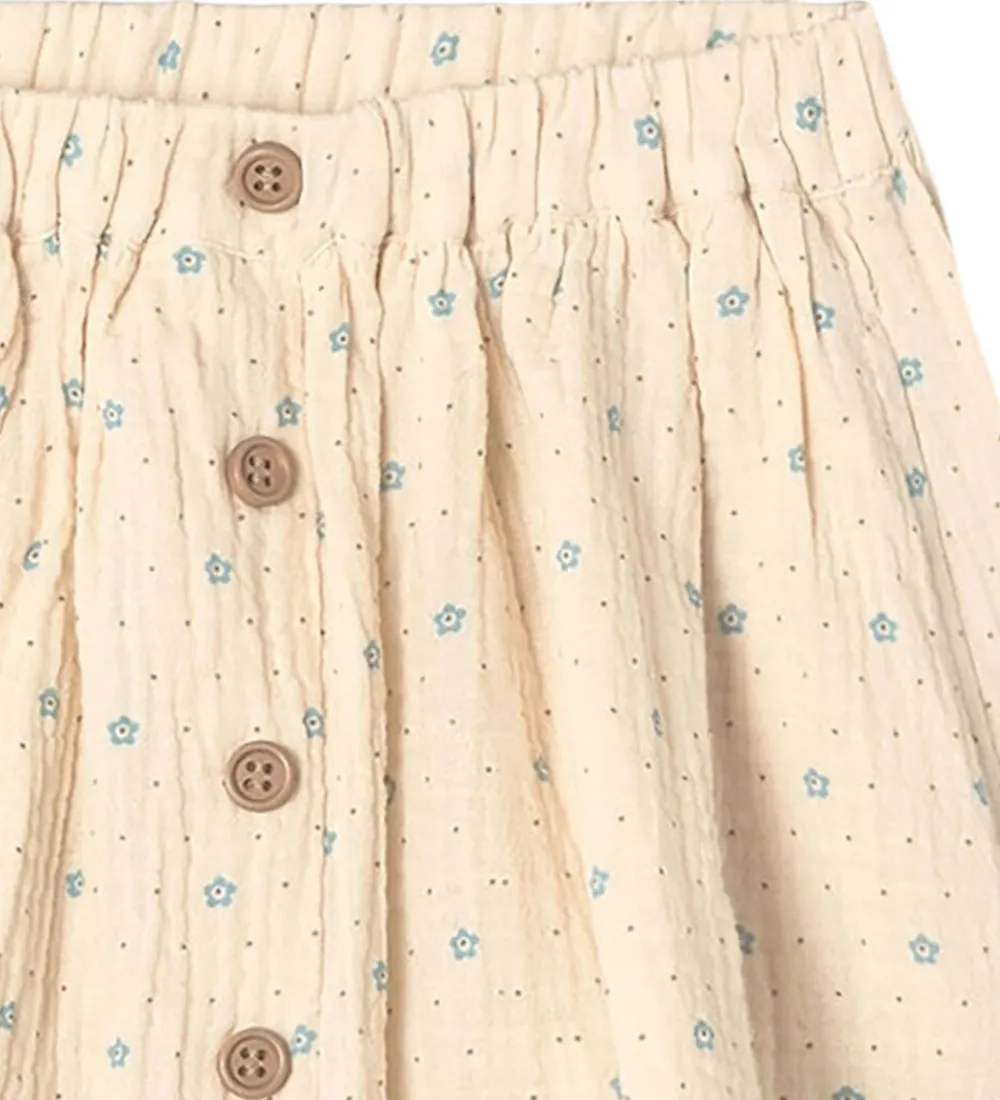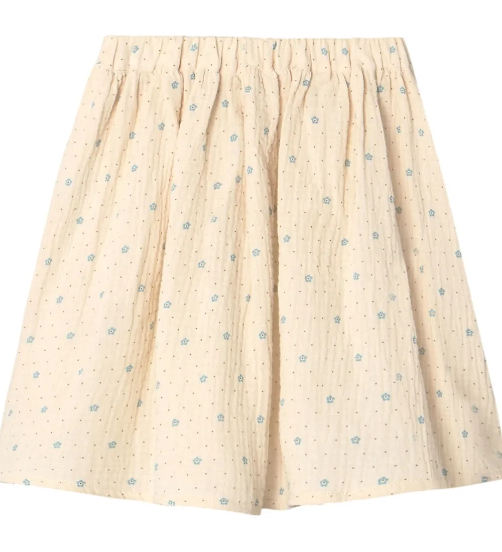 Elegant Fliink nederdel i blød, beige nuance med små, blå blomsterdetaljer og brune prikker. Fliink nederdelen har en elastisk talje, der sikrer en god pasform. Stoffets lette, musselin struktur giver et indbydende udseende.