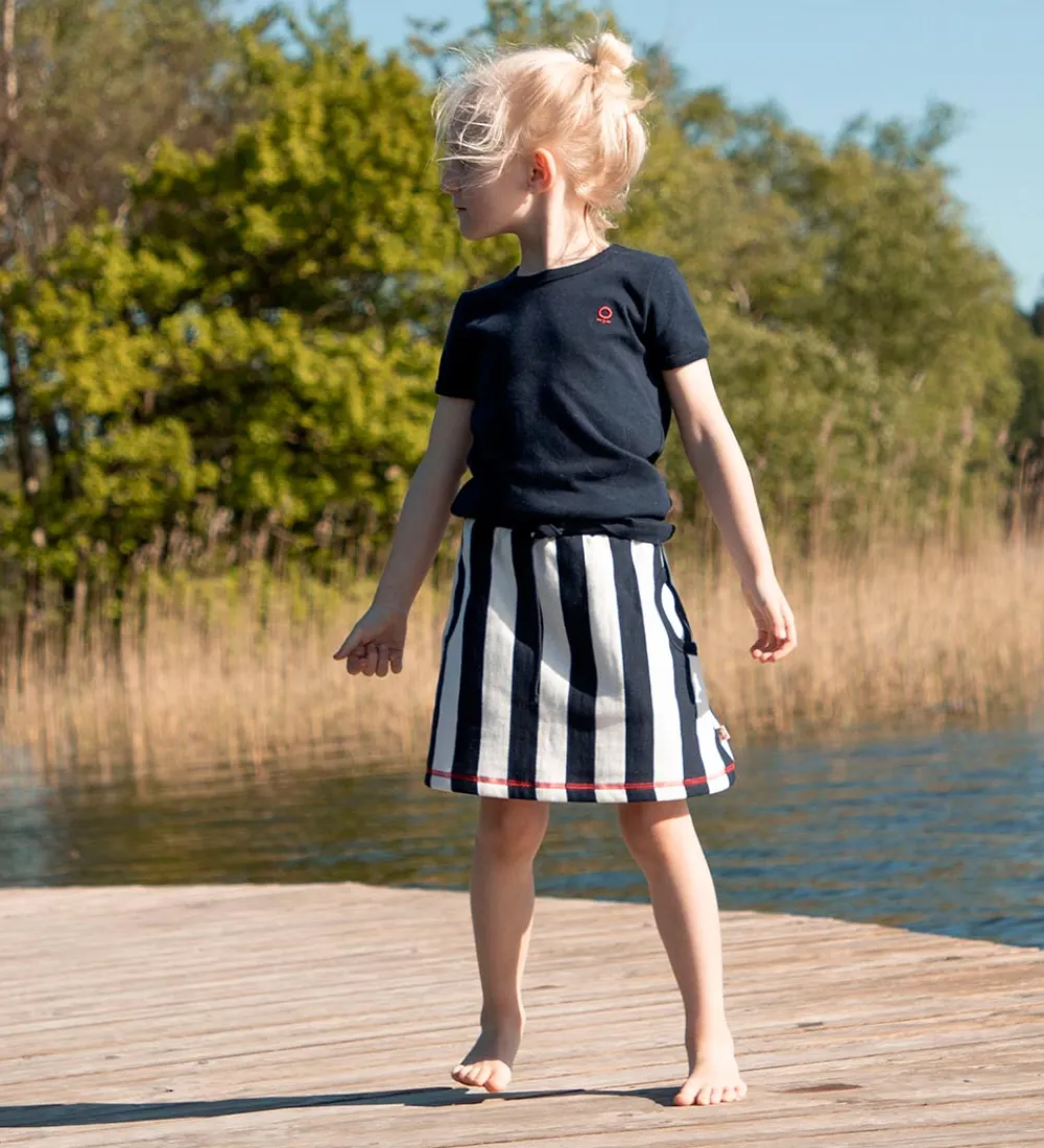 Flot Katvig nederdel med striber i hvid og navy, dekoreret med fine detaljer. Den har en elastisk talje som justeres med snører og praktiske lommer, der gør den både stilfuld og funktionel for de små.