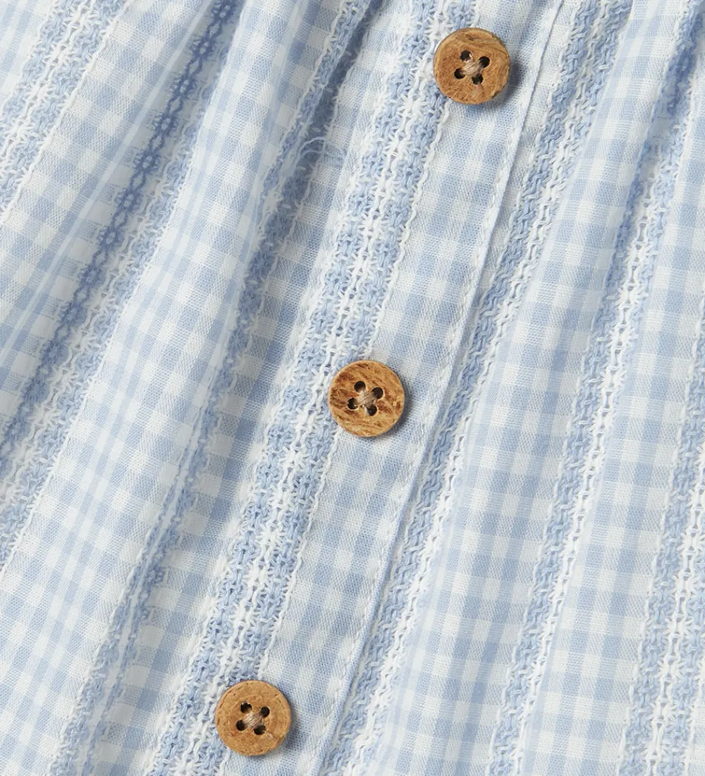 Charmerende Lil Atelier nederdel i lyseblå med et flot ternet mønster. Lil Atelier nederdelen har en justerbar elastisk talje og dekorative knapper foran. En yndig bølgedetalje langs kanten giver et elegant touch.