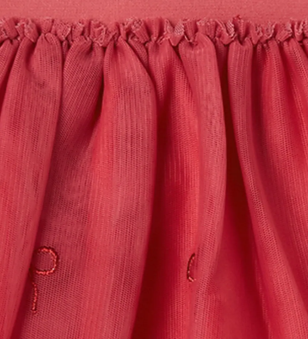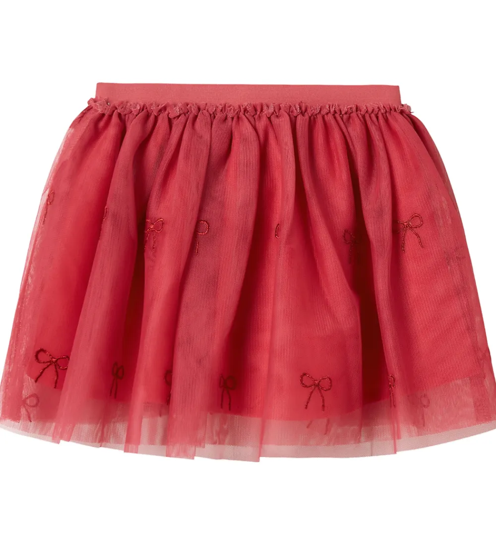 Elegant Name It nederdel i en mørk rosa nuance med broderede sløjfer i rød glimmer. Nederdelen har en elastik i taljen og består af et lag genanvendt polyester inderst og to lag tyl udenpå.