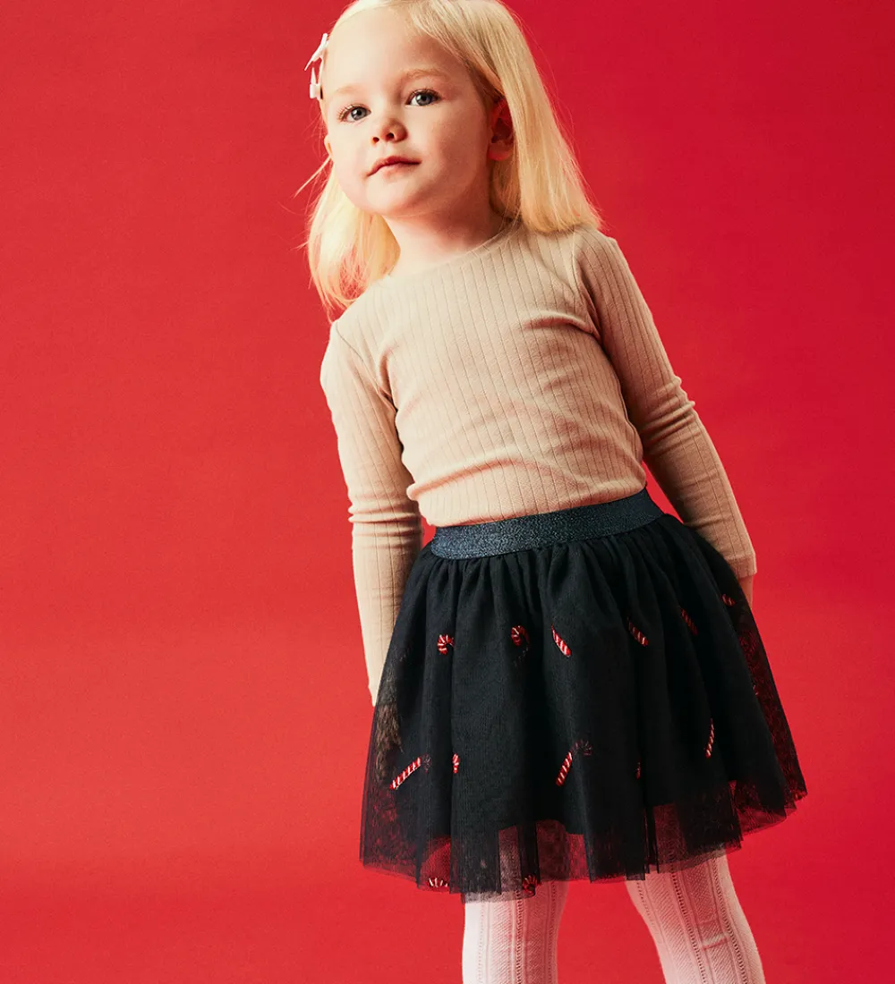 Charmerende Name It nederdel i en mørk blå farve med festligt slikstænger-print i rød og hvid. Nederdelen har en elastisk talje, der sikrer en god pasform og komfort hele dagen.