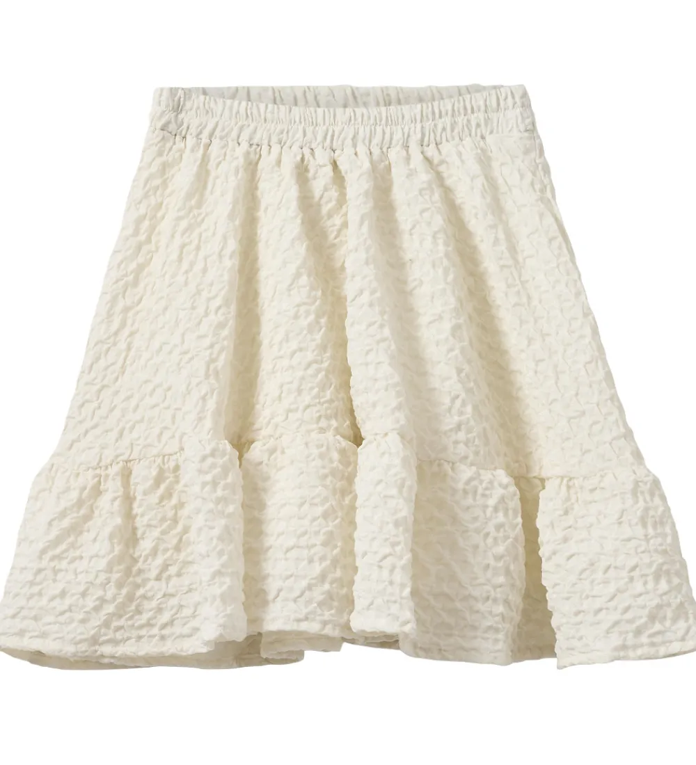 Smuk Sofie Schnoor nederdel i en cremehvid nuance med elastisk talje. Den har flot struktur og fine detaljer, der giver et elegant udtryk. Nederdelen består af to lag med bomuld inderst og polyester yderst.