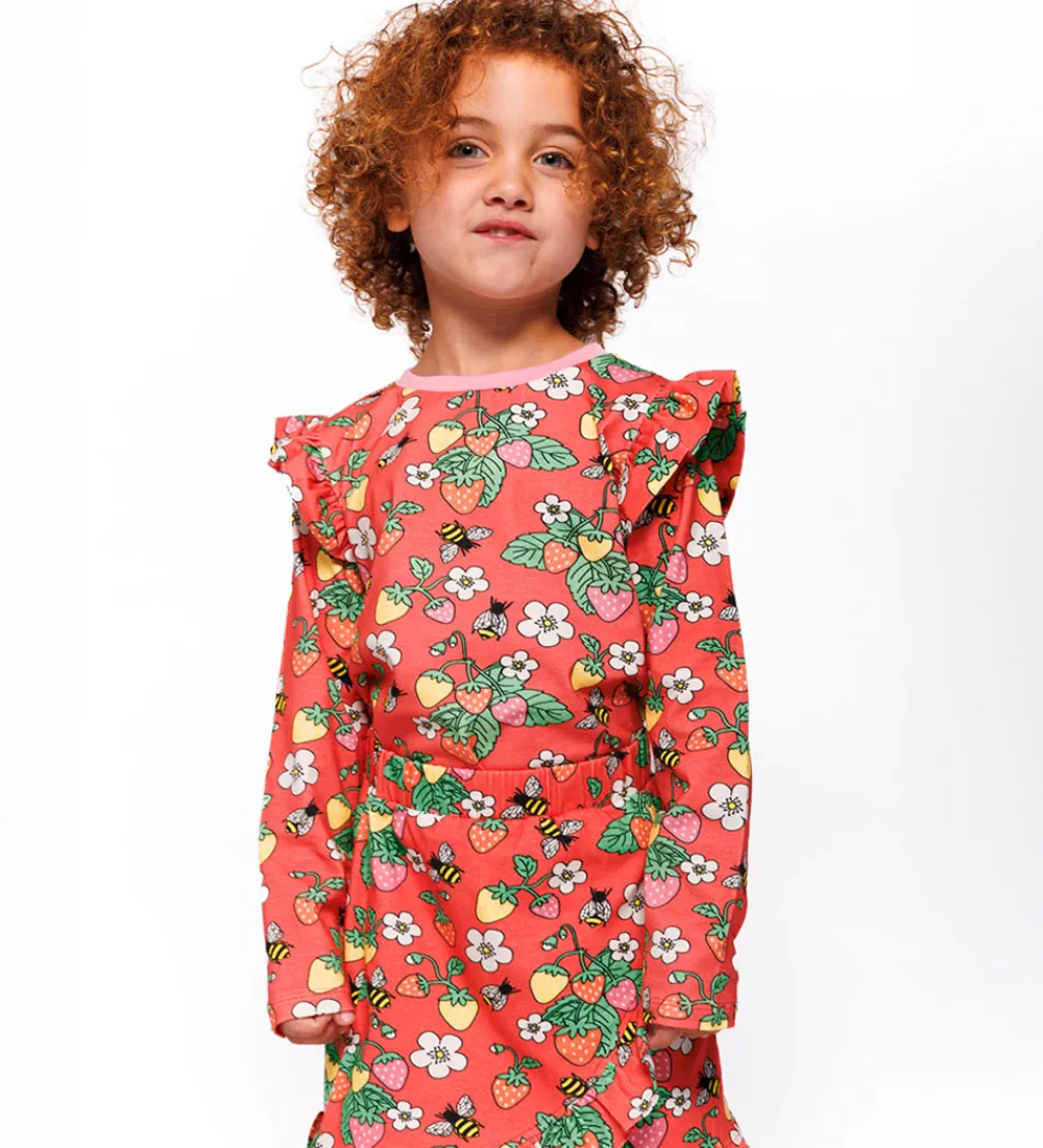 Farverig Småfolk nederdel i en rød nuance med et livligt print af jordbær, blomster og bier. Nederdelen har en let volangkant, der giver et fint udtryk. Et skønt valg til leg og hverdag.