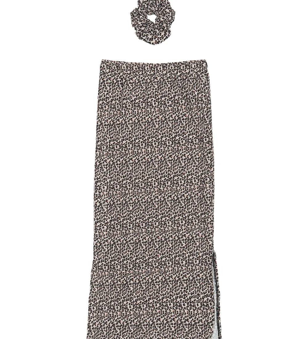 Flot The New nederdel med matchende scrunchie i et allover leopardmønster og i en skøn og strækbar kvalitet med plisseret struktur. Nederdelen fra The New er en lang model med en slids i hver side, så der er plads til bevægelse. Den har en behagelig pasform med en bred, elastisk talje for nem tilpasning og kan justeres yderligere med knapper indvendigt.