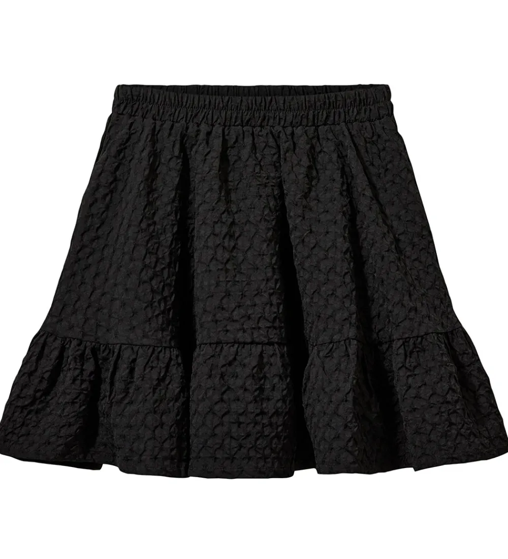 Stilfuld Sofie Schnoor nederdel i en klassisk sort farve med en struktureret overflade. Nederdelen består af to lag med bomuld inderst og polyester yderst.