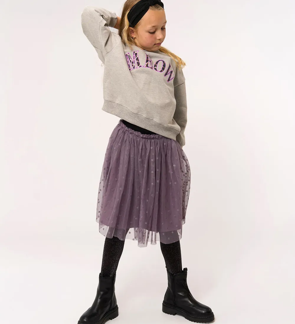 Yndig nederdel fra The New i støvet lilla tyl og med små sølvglimmer smileys over det hele. The New nederdelen har en elastisk talje, som sikrer en god pasform og har desuden et blødt og glatvævet underskørt, så den ikke fremstår gennemsigtig.